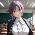 dark teal blazer, white silk blouse, black trousers, black low heels, wearing thin black metal-frame round glasses # 眼鏡教師の知的ビジネス