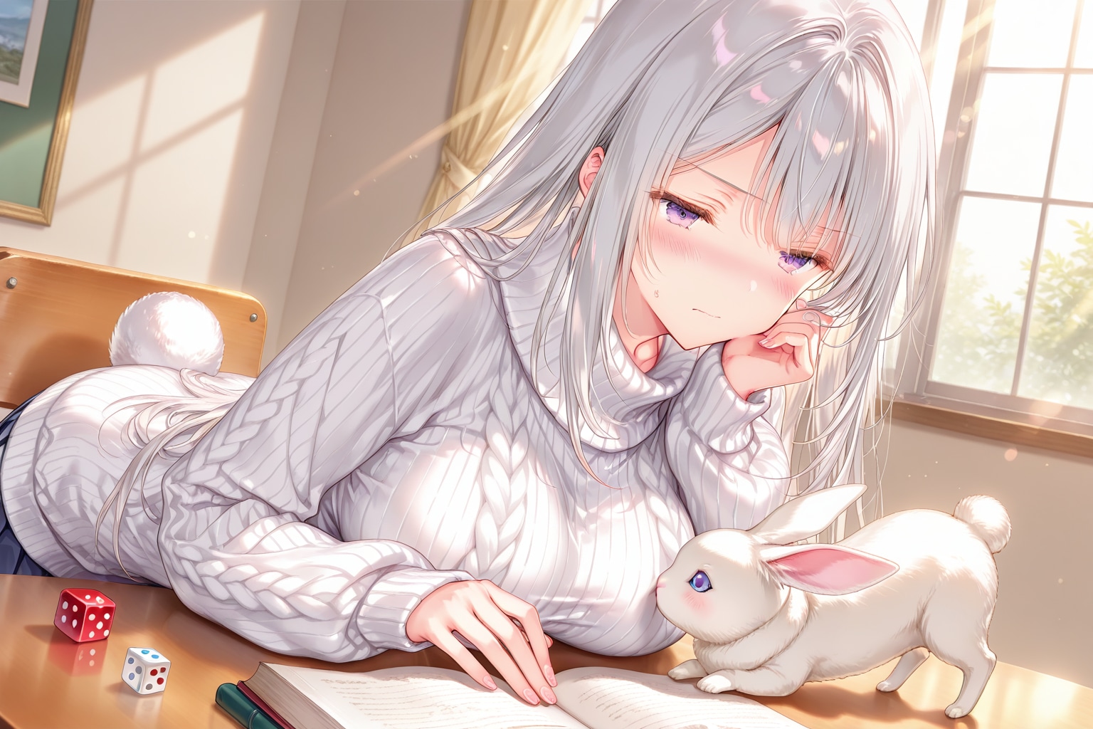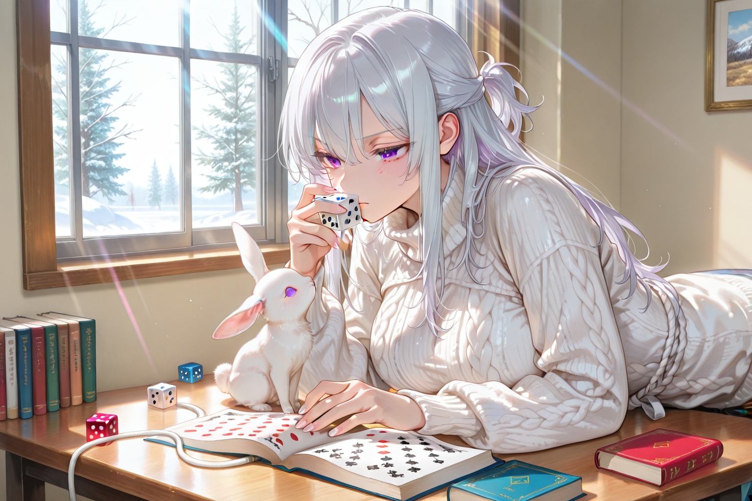 そして机の上に仔猫と仔兎がいて、ダイスの匂いを嗅いだり前脚で転がしてる状況を。