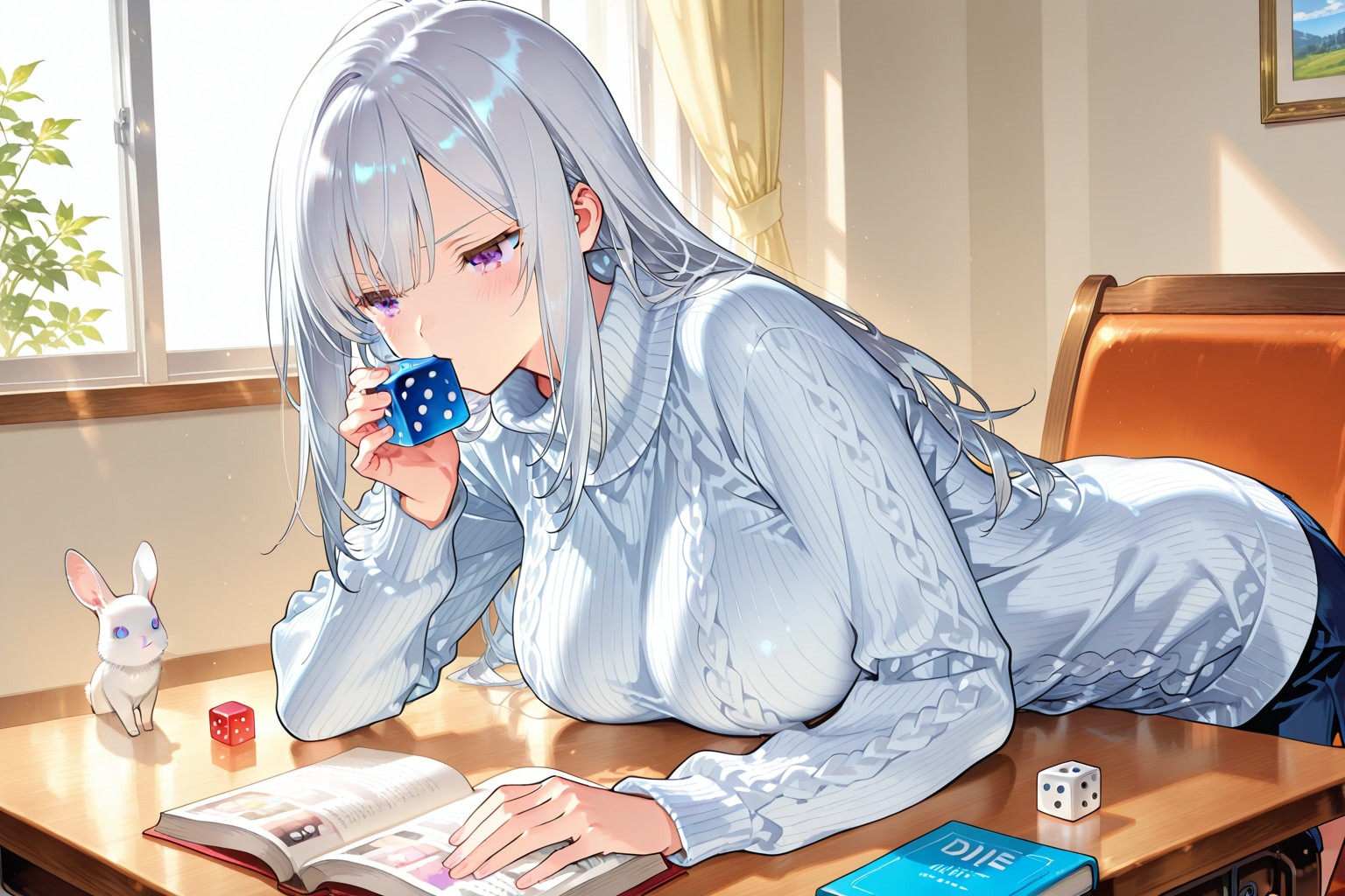 本当は6面ダイスを振って、机の上に10面ダイスが転がってる状況を狙ってプロンプトを組んでみたんですけどね。