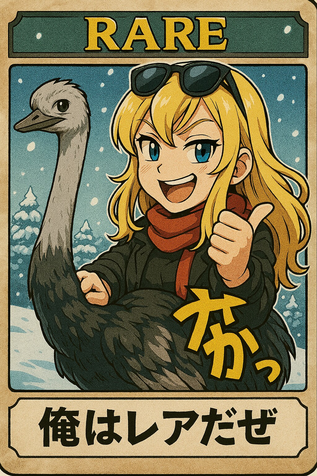 なつみさんがダチョウのレアに騎乗してドヤ顔 ダチョウが「俺はレアだぜ」と発言する絵面のトレカ 冬