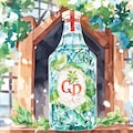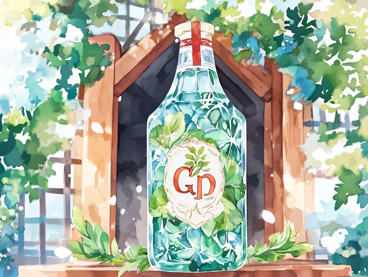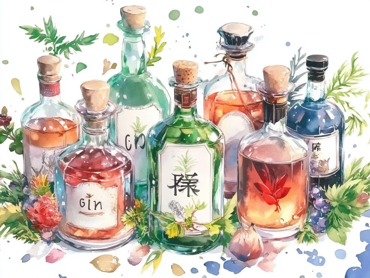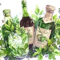 水彩で描かれた、様々なボトルとハーブの静物画です。ナチュラルで優しい雰囲気を表現しました。