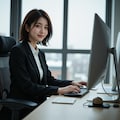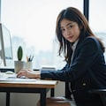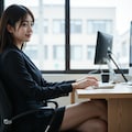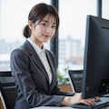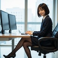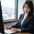 冬のオフィスで働く女性
