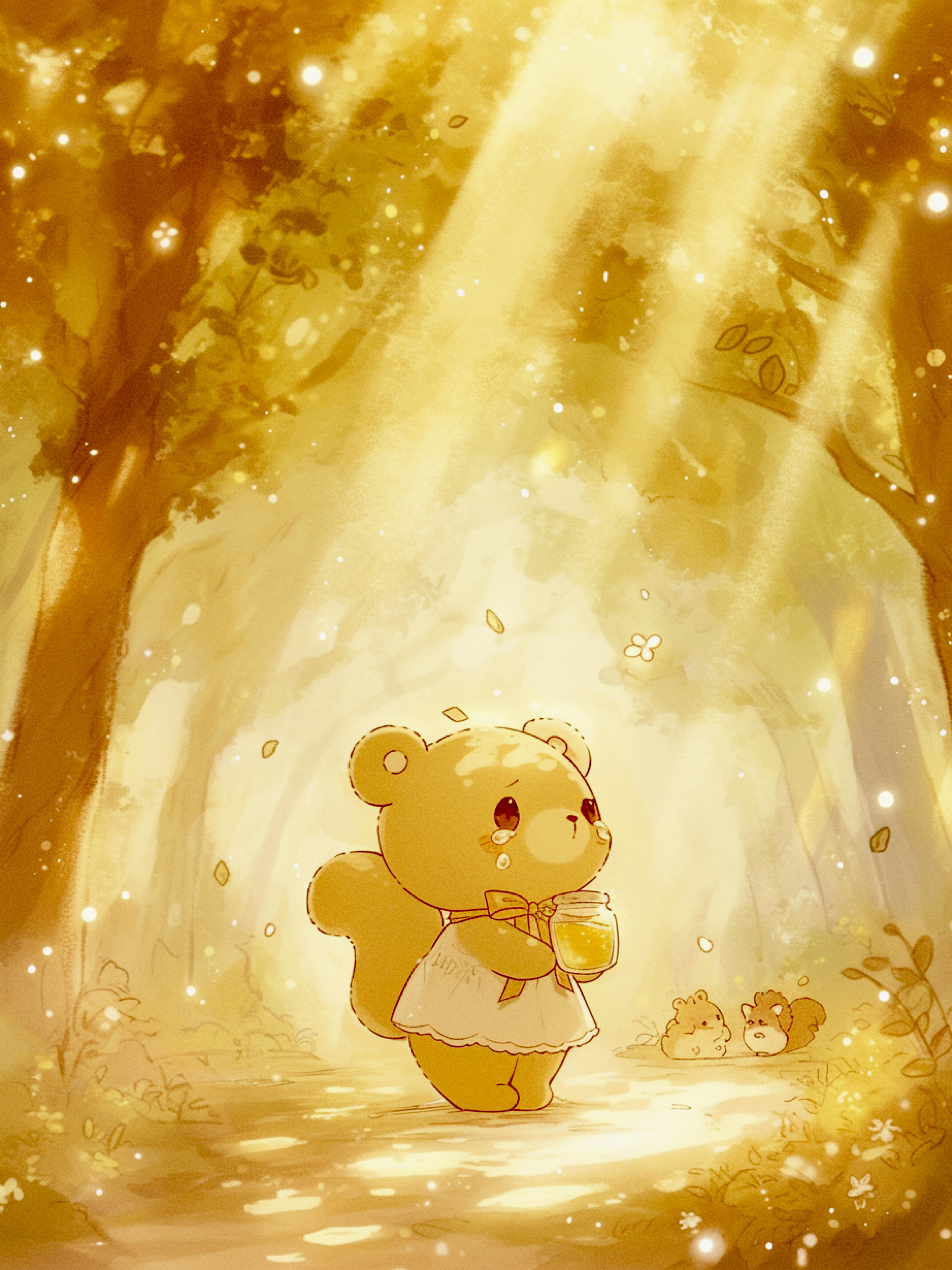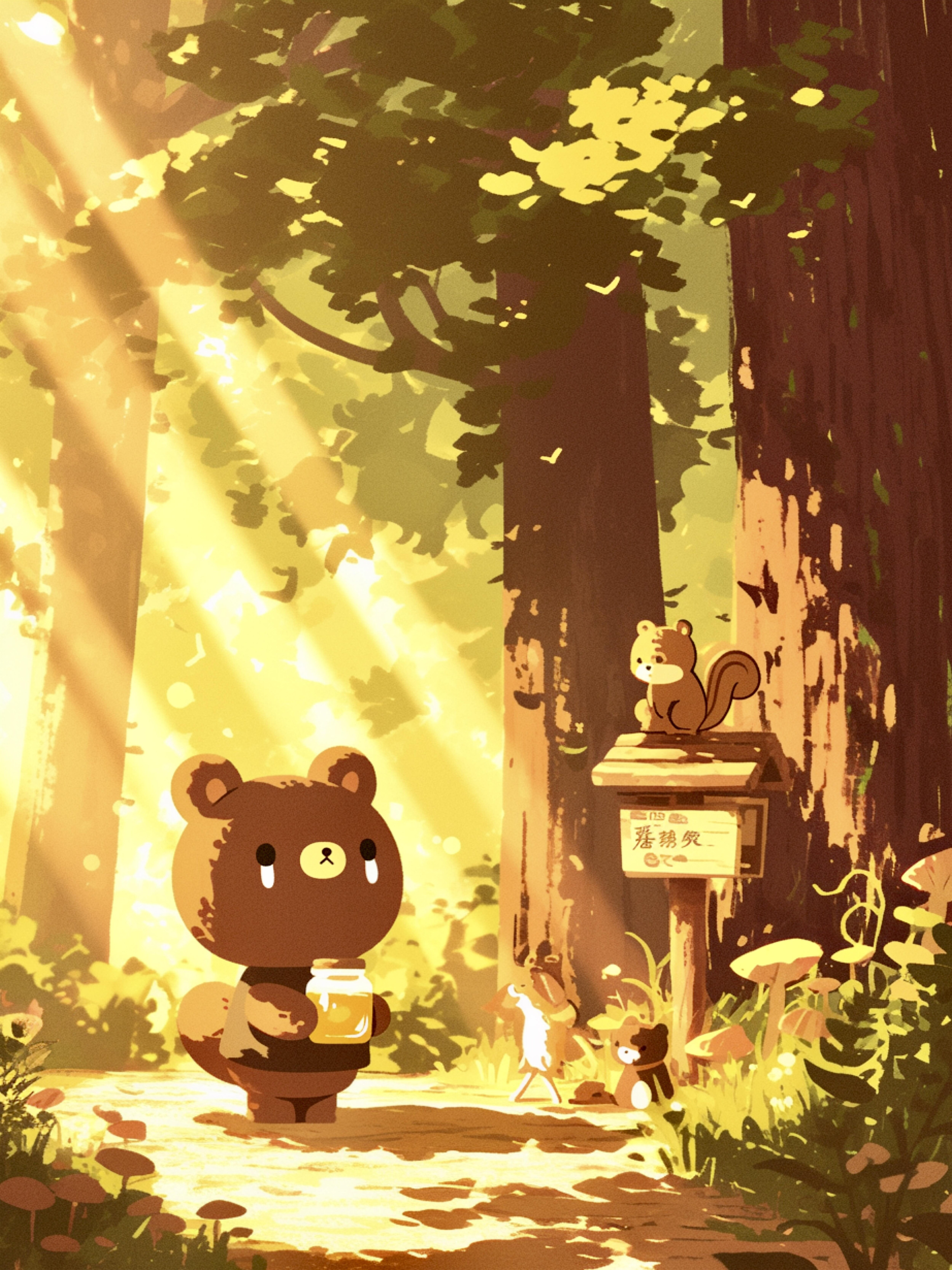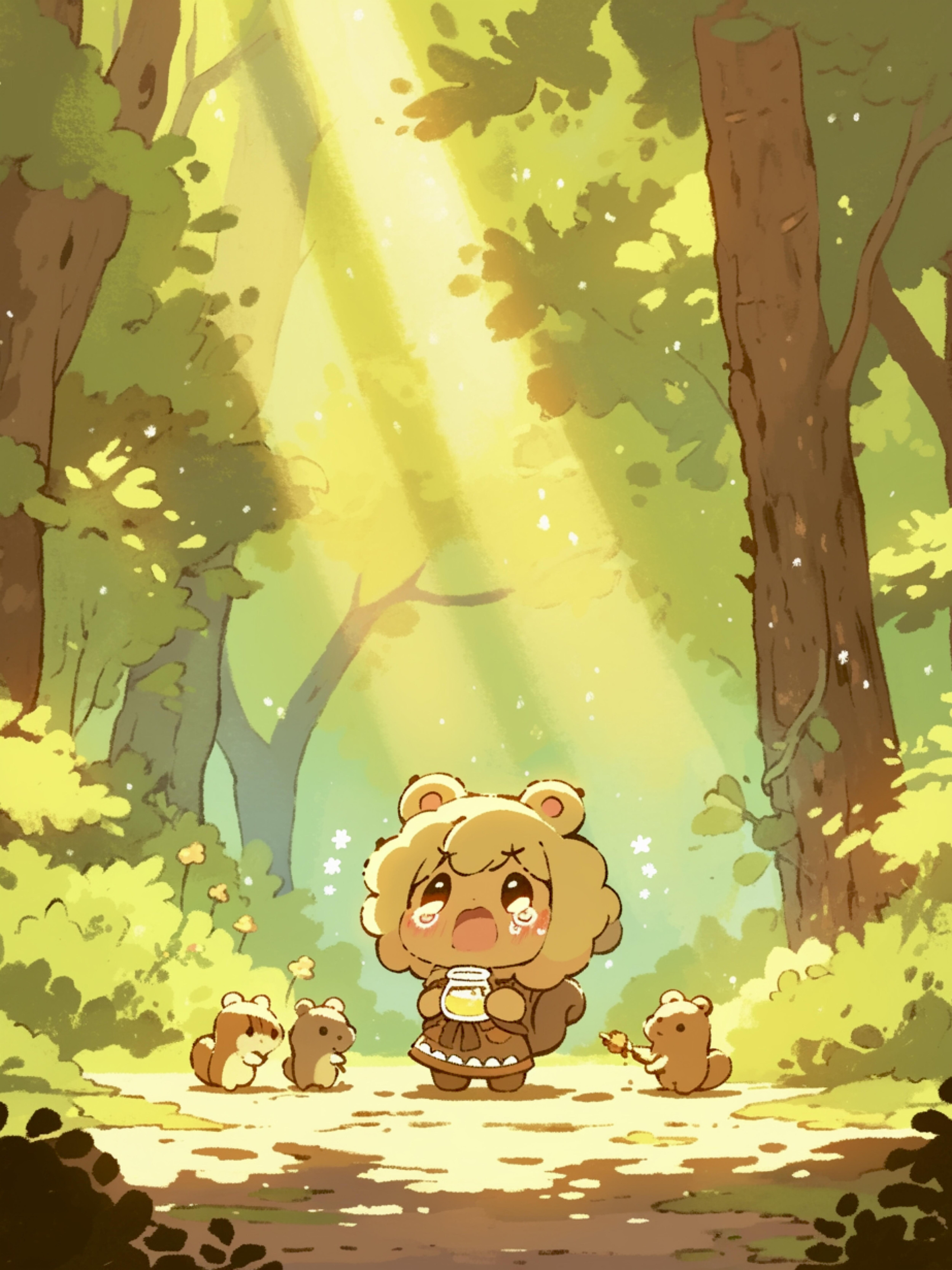森の奥深く、くま娘は甘い香りに誘われてハチミツを探していました。あちこち歩き回り、やっと見つけたハチミツを胸に抱えたとき、ふと気づくと、見慣れた道が見当たりません。ぴえん。