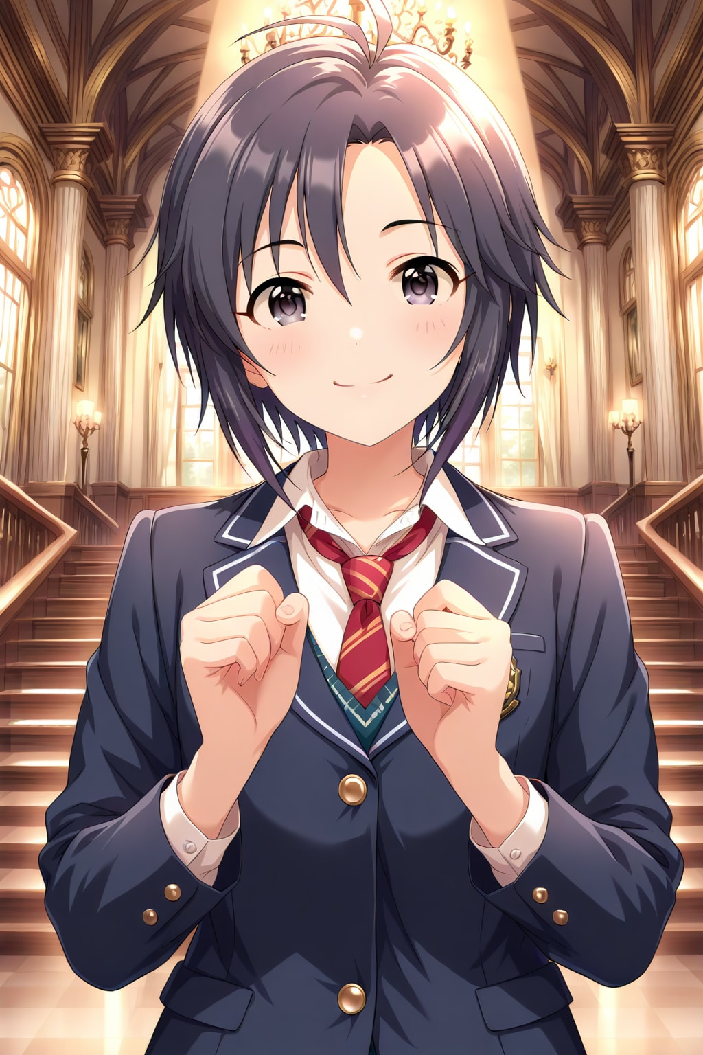 2枚目には、short hair, black hair, ahoge, forehead, black eyes, tareme を含めていない
