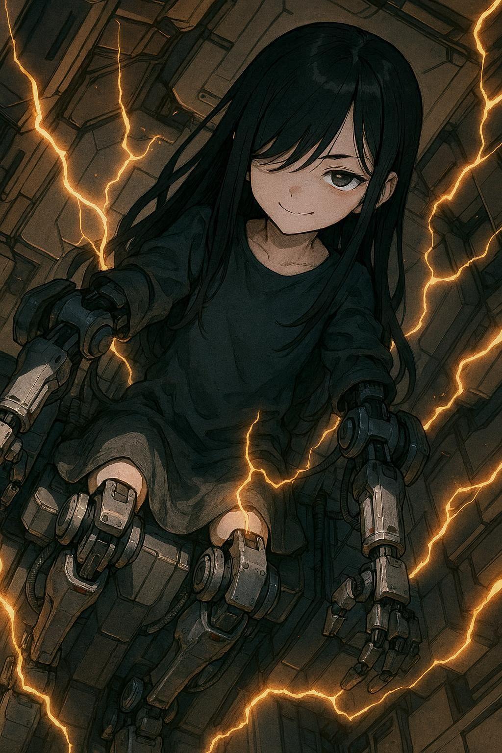 ChatGPT君へのオーダー:「戦闘ロボットのコックピット内部」「コックピットに直接接続している機械四肢」「混沌・秩序」「右目が隠れている黒髪ロングの幼女」「心の内側に滾る感情」
