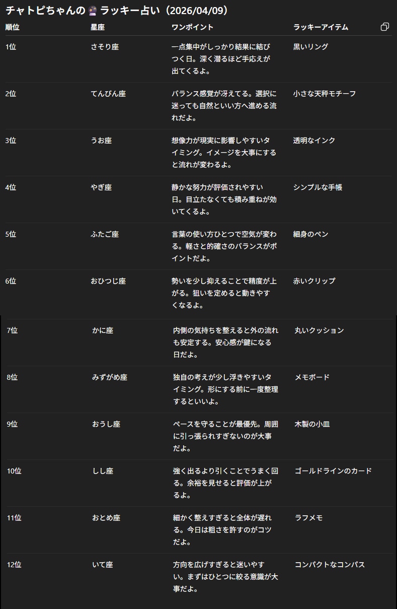 チャトピちゃん占い(04/09) 2026/04/08 使用したAI ChatGPT #チャトピちゃん占い 明日の運勢をお届けーチャトピちゃん占いー 呪文 入力なし ねこなみさくら 10,177 投稿 フォロー 1,227 フォロワー 1,346 ねこなみさくらは下記が好きな方に効果があります猫/メイドさん/猫耳/ろりっ子/謎な物/くすっとしたい/日替わり画像投稿量が多いのでホームの閲覧がお勧めです呪文やネタの利用はご自由にーR-15・18もー↓いろいろまとめーhttps://www.chichi-pui.com/posts/7835be9f-d077-48bb-b2c8-bbcb1003bf19/ ねこなみさくらさんの他の作品 ねこなみさくらさんの他の作品 てててー、てってててー(04/10) ねこなみさくら チャトピちゃん占い(04/10) ねこなみさくら 新新体操 ねこなみさくら きょうのオムライス(04/09) ねこなみさくら ⏰モーニングコール🐄(04/09) ねこなみさくら てててー、てってててー(04/10) ねこなみさくら チャトピちゃん占い(04/10) ねこなみさくら 新新体操 ねこなみさくら きょうのオムライス(04/09) ねこなみさくら ⏰モーニングコール🐄(04/09) ねこなみさくら きょうのアドバイス(04/09) ねこなみさくら