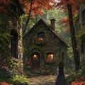 静かな秋の森の小屋