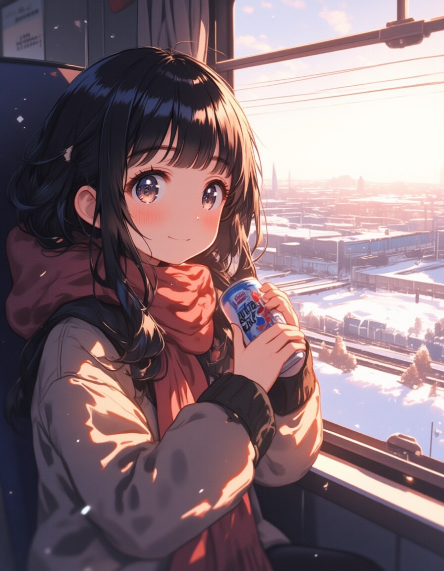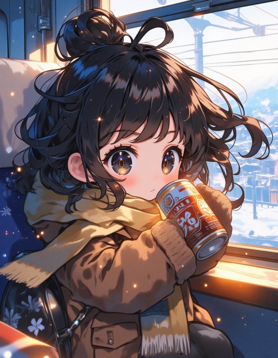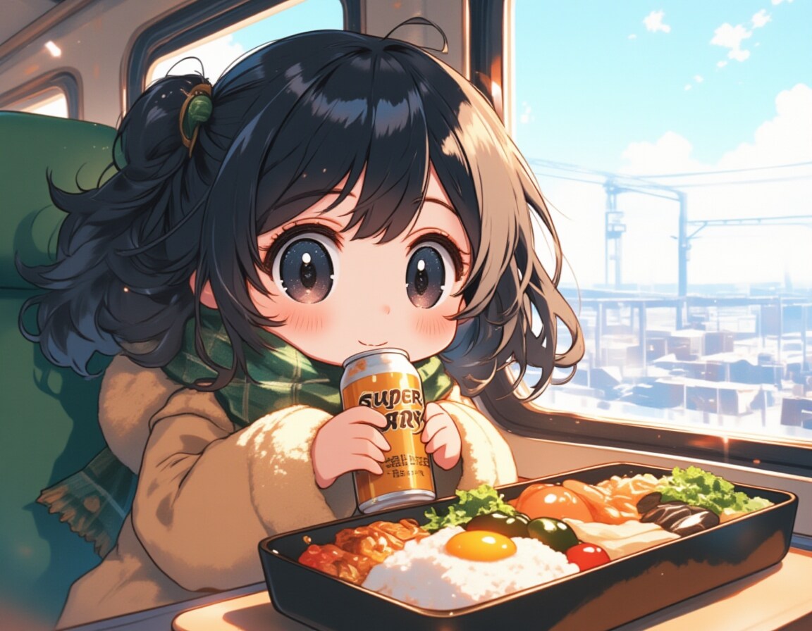 A chibi-style 8-year-old girl with oversized, sparkling black eyes and fluffy, flowing black hair that looks soft and bouncy. She is sitting in a high-speed train, holding a can of "Super Dry" beer in her tiny hands, lifting it adorably to her lips with a content smile. She is bundled up in an oversized winter coat and scarf, her cheeks slightly flushed from the cozy warmth inside the train. On the small table in front of her is a neatly packed bento box, filled with colorful dishes like rice, tamagoyaki, and pickled vegetables, adding charm to the scene. Outside the window, a snow-covered countryside stretches endlessly, enhancing the peaceful and joyful atmosphere of her winter train journey.