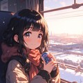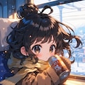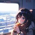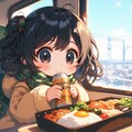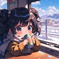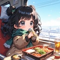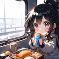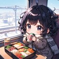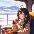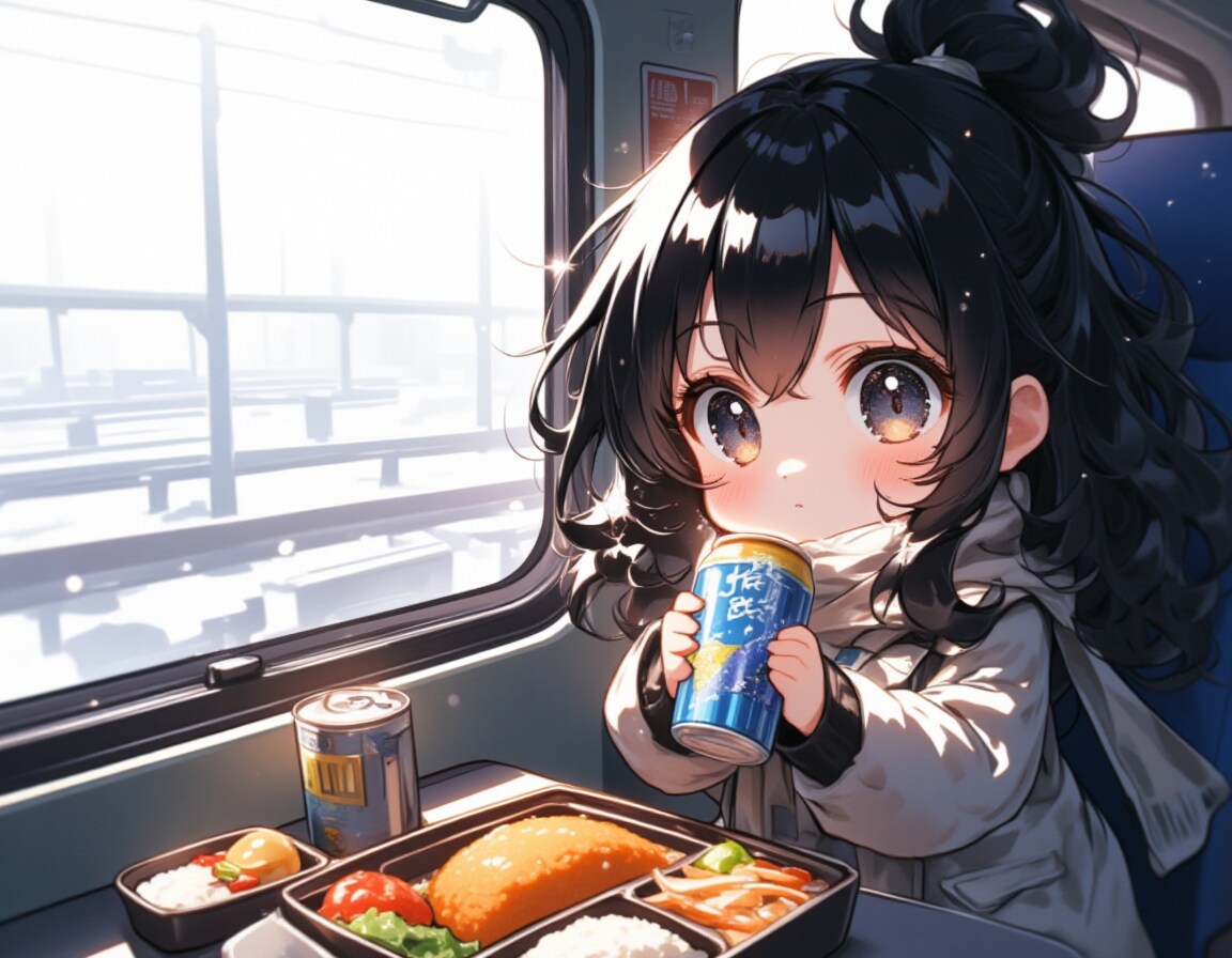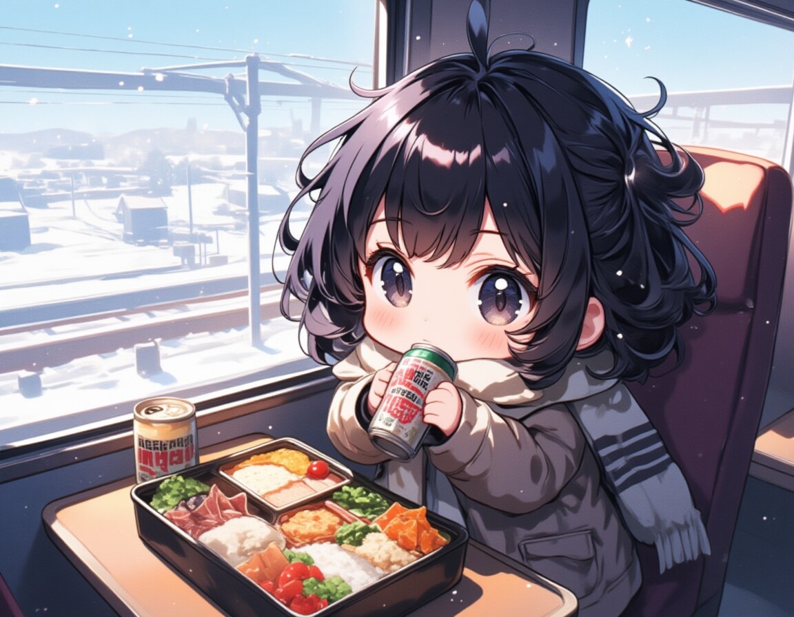 ちびキャラの女の子が冬の列車でビールとお弁当を楽しむ風景
