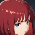 bob cut, red hair, bangs, blue eyes, round face, wide-set eyes, flat chest