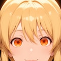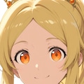 ponytail, blonde hair, orange eyes, round face, wide-set eyes