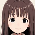 long hair, dark brown hair, blunt bangs, black eyes, round face, wide-set eyes, flat chest