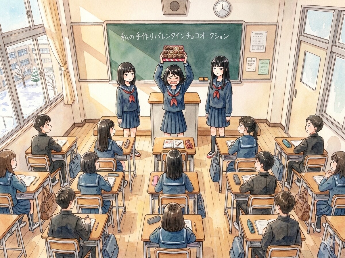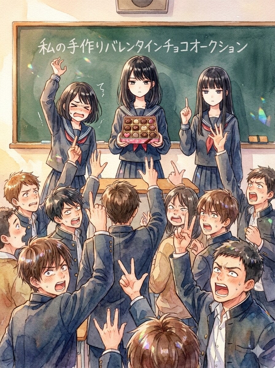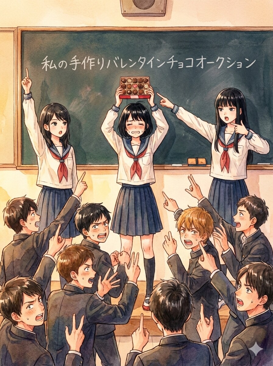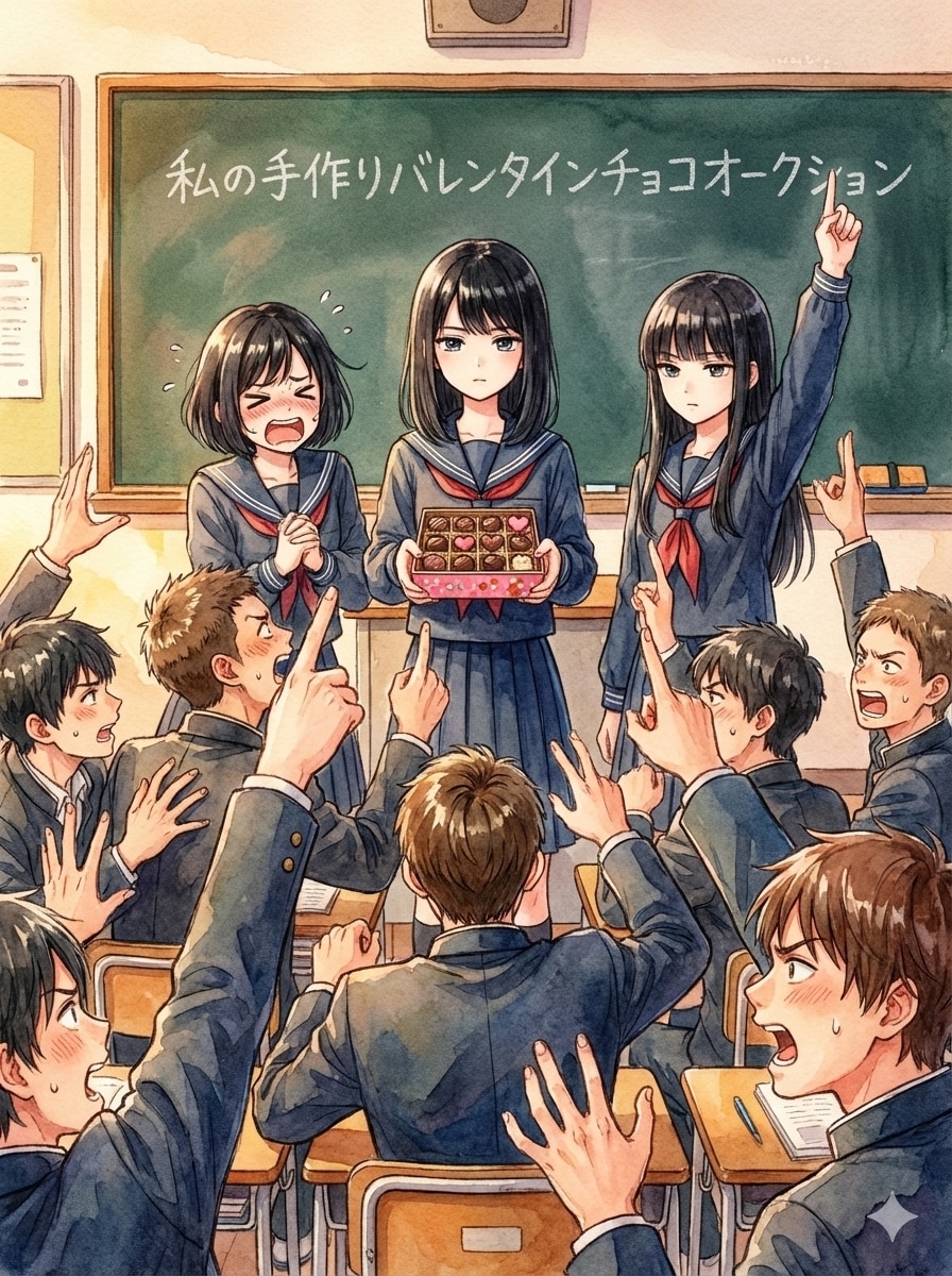 1枚目から3枚目、黒髪ミディアムヘアーの女子高生「私が作ったチョコ欲しい人~」