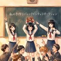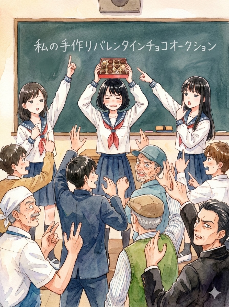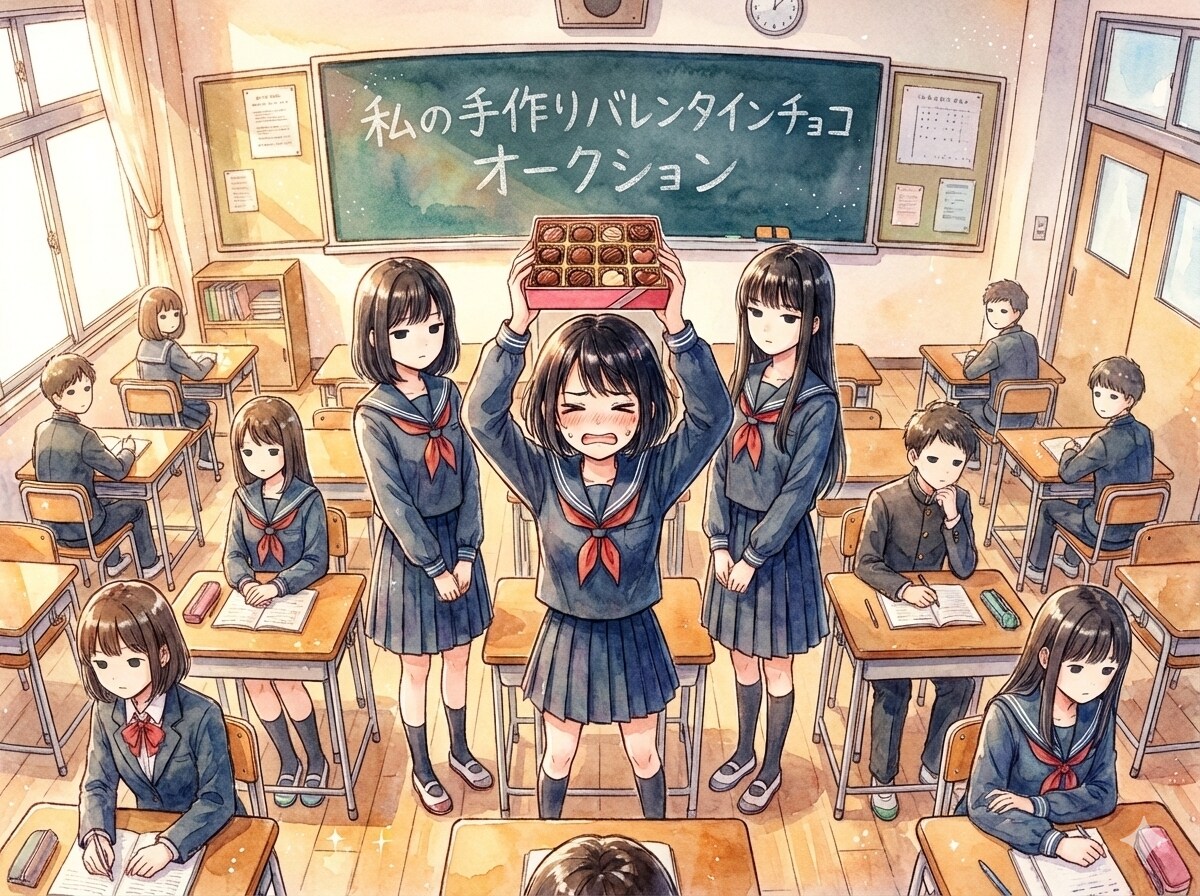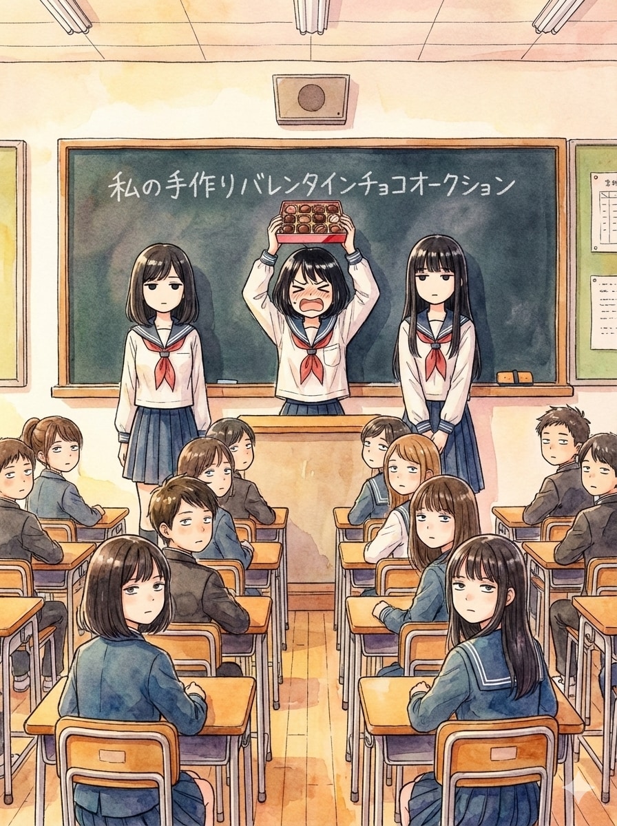 4枚目から6枚目、黒髪ショートヘアーの女子高生「私が作ったチョコ欲しい人~」「欲しい人いませんか~」