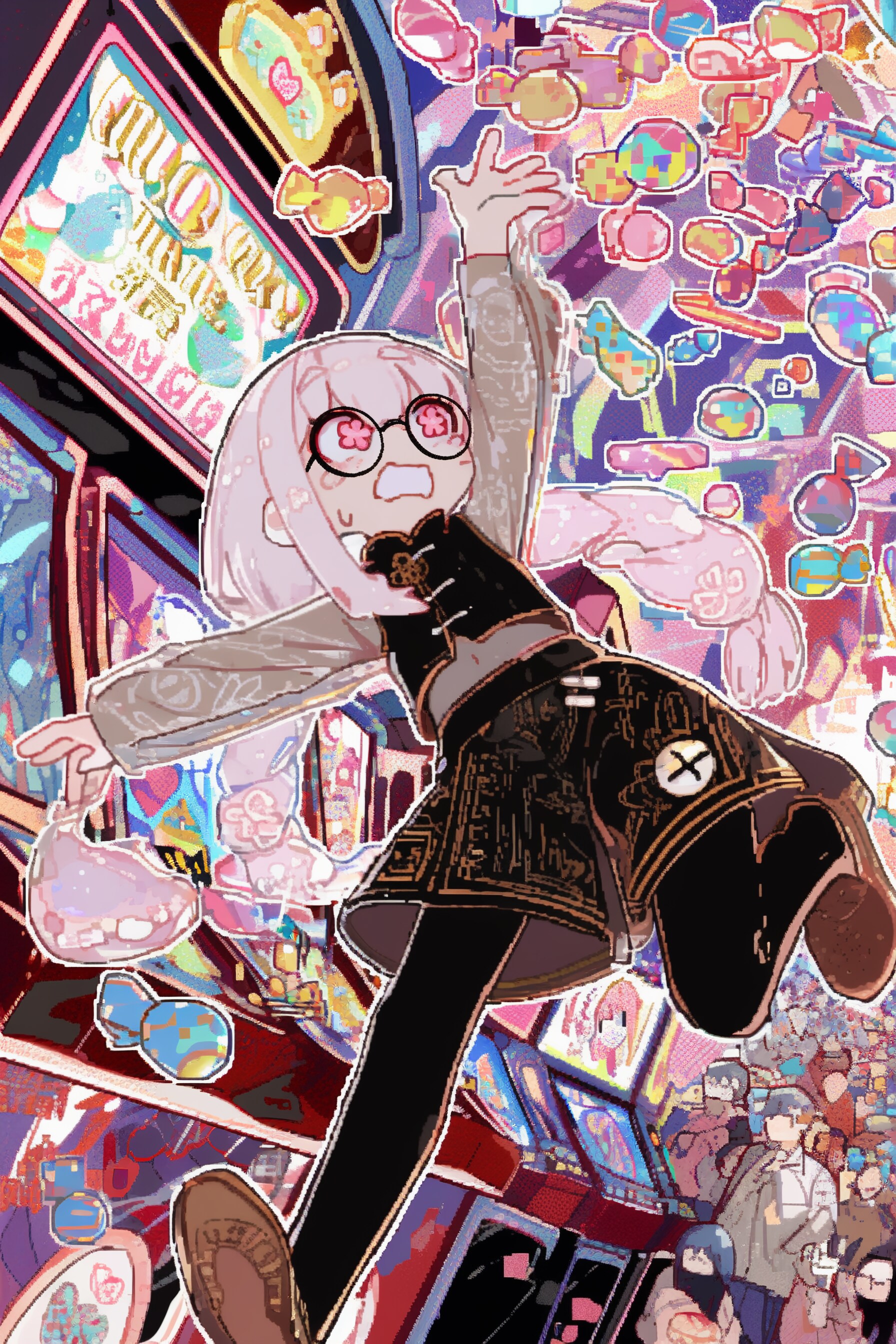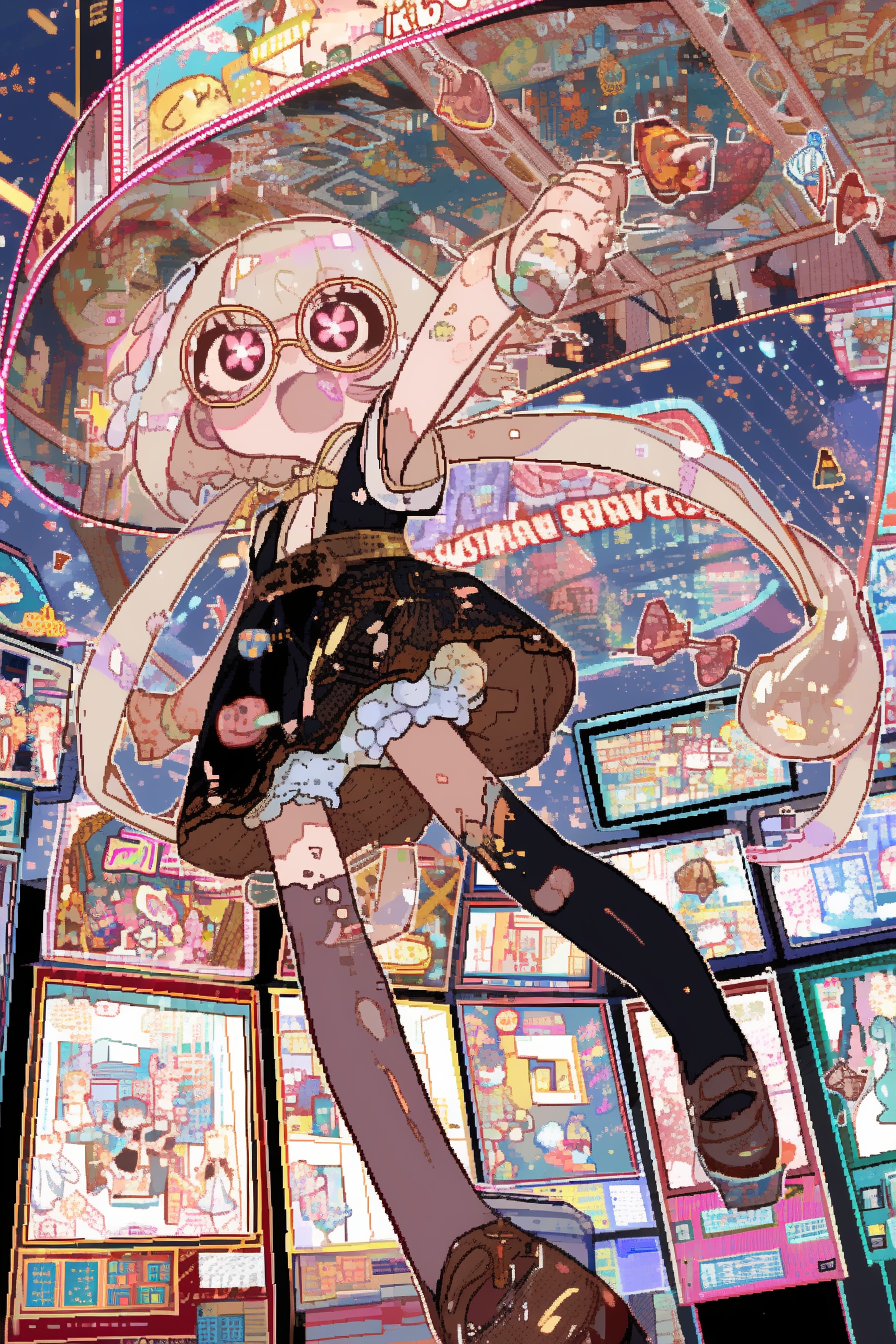 観衆を前にゲームセンターでお菓子の掴み取り大会に参加するスライムちゃんのイラストをつくってみました。正方形の絵のおまけです。