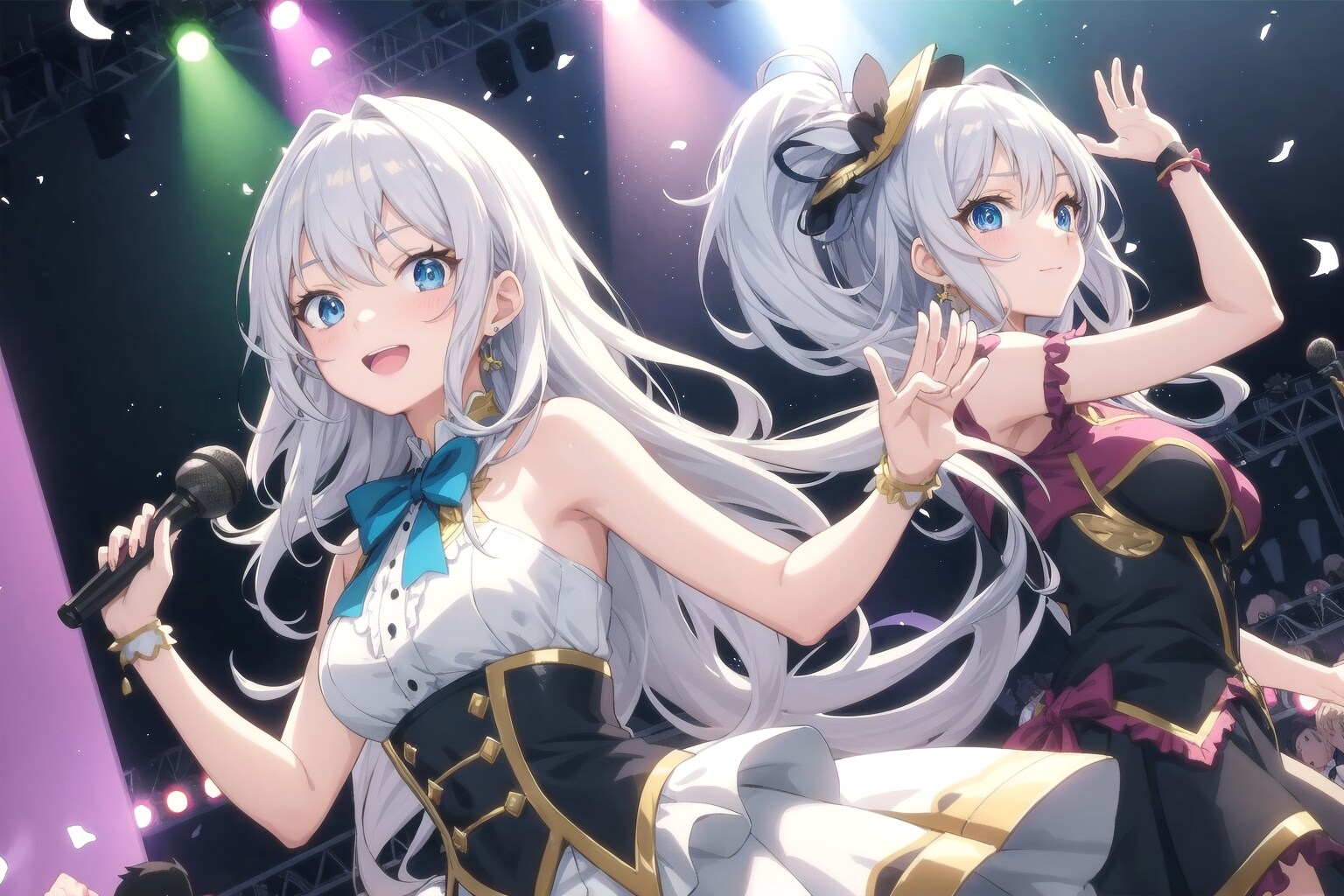 真逆の衣装に身を包んだ二人は、まるで光と影。白の彼女は天使みたいに柔らかく、黒の彼女はクールで芯が強い。だけど並んだ時、どっちも「尊い!」って叫びたくなるほど完璧に噛み合う。ステージの真ん中で笑い合う姿に、世界が幸せで満ちていく。