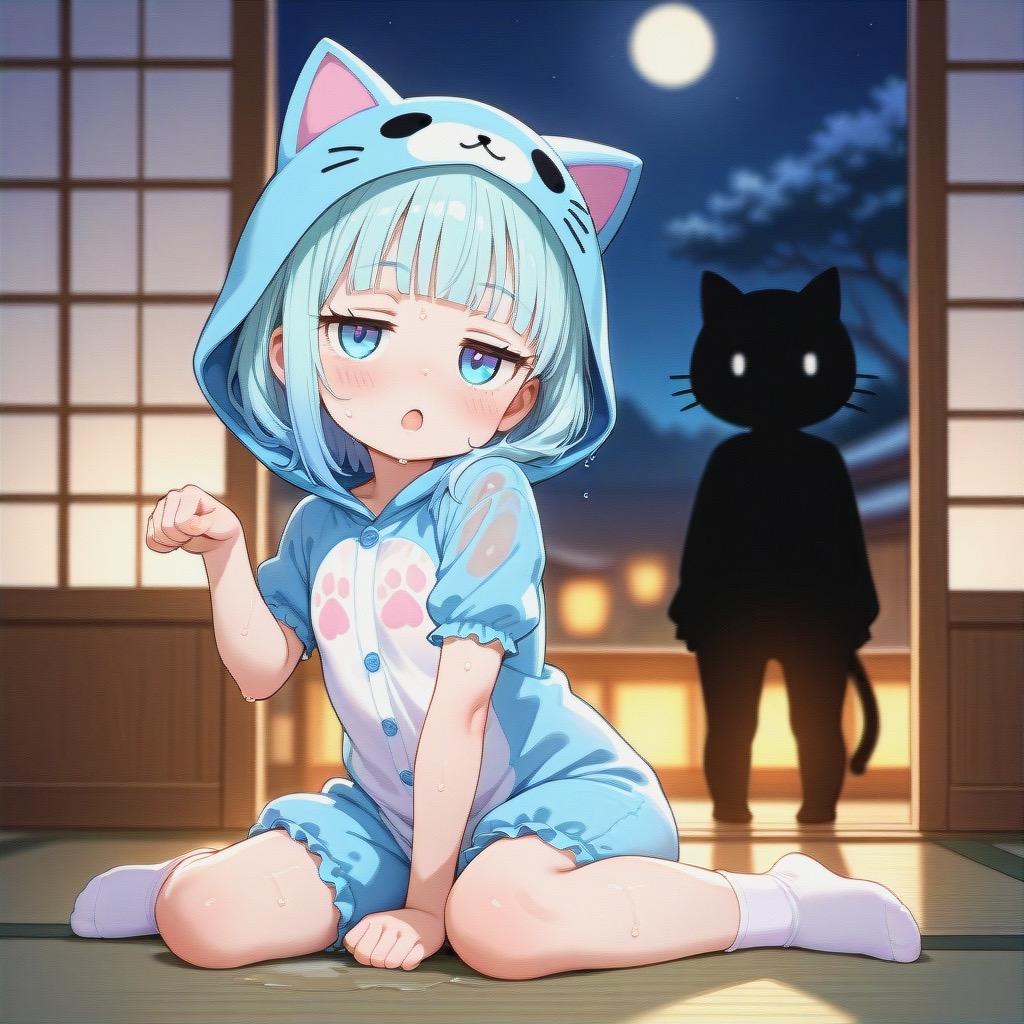 肩から水がぽたぽた落ちるなか、猫又はその場でフリーズ。