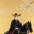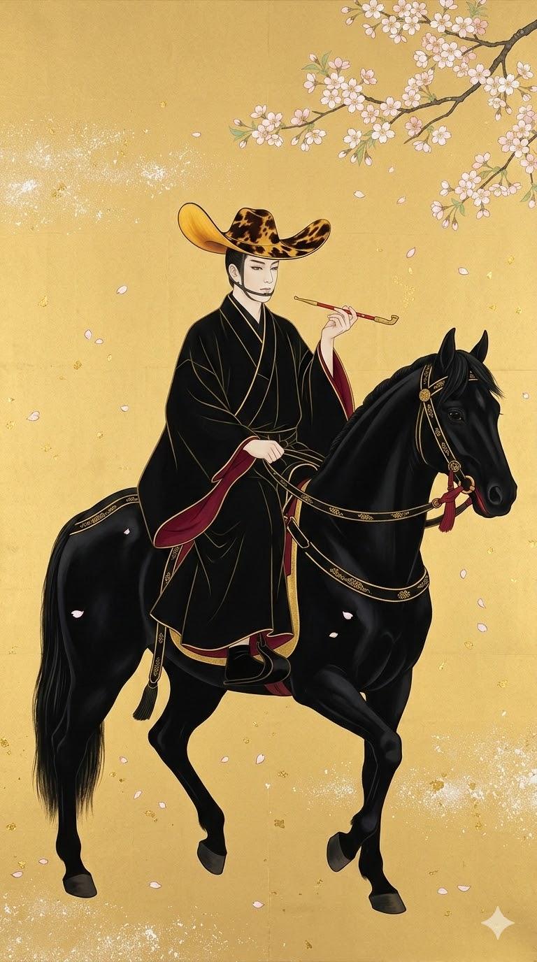 「鼈甲製の唐人笠を被り、全身に足袋まで黒尽くめの衣装(金縁で内側は赤)をまとい、煙管を咥え、漆黒の馬に乗る」
