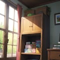 room, eat steel object in shelf, around paper, red, note on table, tree, shade object, art,