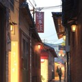 rainy traditional town alley, electric rope, text , tree,