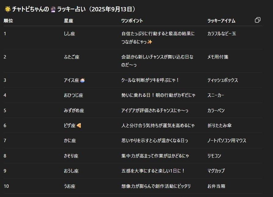 チャトピちゃん占い(09/13) 2025/09/12 使用したAI ChatGPT #チャトピちゃん占い 明日の運勢をお届けーチャトピちゃん占いー 呪文 入力なし ねこなみさくら 9,600 投稿 フォロー 1,176 フォロワー 1,285 ねこなみさくらは下記が好きな方に効果があります猫/メイドさん/猫耳/ろりっ子/謎な物/くすっとしたい/日替わり画像投稿量が多いのでホームの閲覧がお勧めです呪文やネタの利用はご自由にーR-15・18もー↓いろいろまとめーhttps://www.chichi-pui.com/posts/7835be9f-d077-48bb-b2c8-bbcb1003bf19/ ねこなみさくらさんの他の作品 ねこなみさくらさんの他の作品 チャトピちゃん占い(02/14) ねこなみさくら ちゅーっ ねこなみさくら 日付を入れてみる 02/13 ねこなみさくら きょうのこはるさん2 ねこなみさくら きょうのオムライス(02/13) ねこなみさくら チャトピちゃん占い(02/14) ねこなみさくら ちゅーっ ねこなみさくら 日付を入れてみる 02/13 ねこなみさくら きょうのこはるさん2 ねこなみさくら きょうのオムライス(02/13) ねこなみさくら てててー、てってててー(02/13) ねこなみさくら