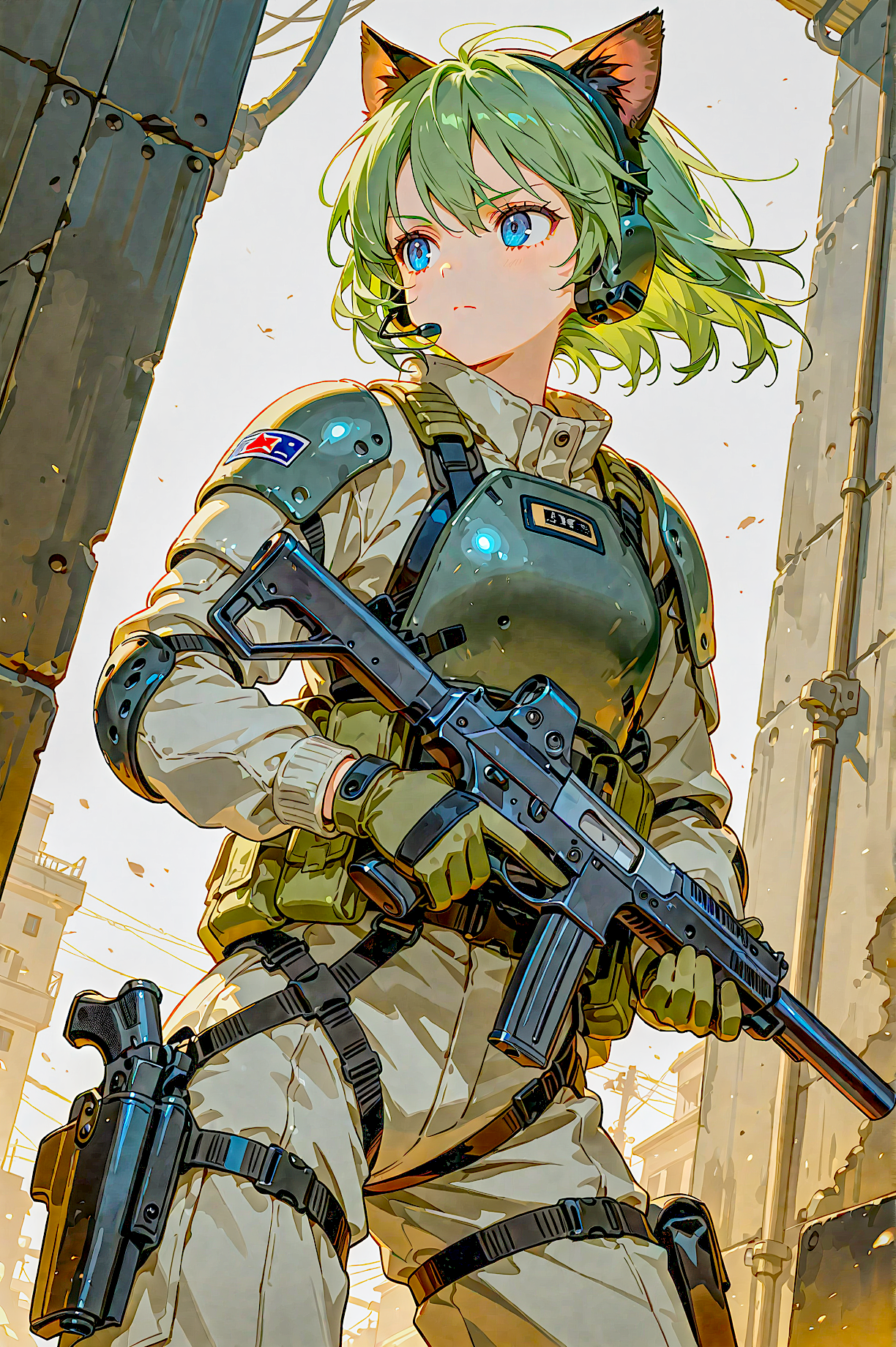 ・元絵はSDXL製です。ハンドガンを指定したんですがSMGぽくもライフルぽくもあるメーカー無指定の銃が出ました。これはGeminiにi2iする時点で別の最新銃に変える予定だったのですがうまくいきませんでした。映画のキービジュアルっぽいのがばっちり出せたのでそこはヨシとしたのです。