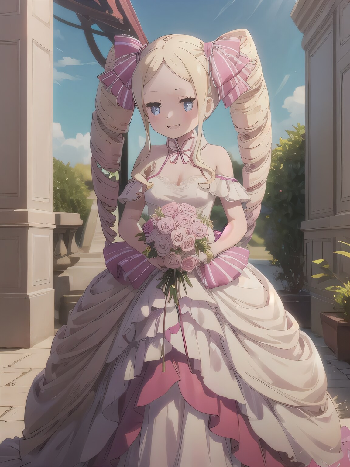 陽光が降り注ぐ洋館の中庭。鮮やかな緑の芝生の上に、純白のウェディングドレスがひらりと揺れる。金髪をピンクのリボンで結い、ドリルのように巻いたツインテールが風に踊る。彼女の青い瞳は、幸せに輝いていた。
