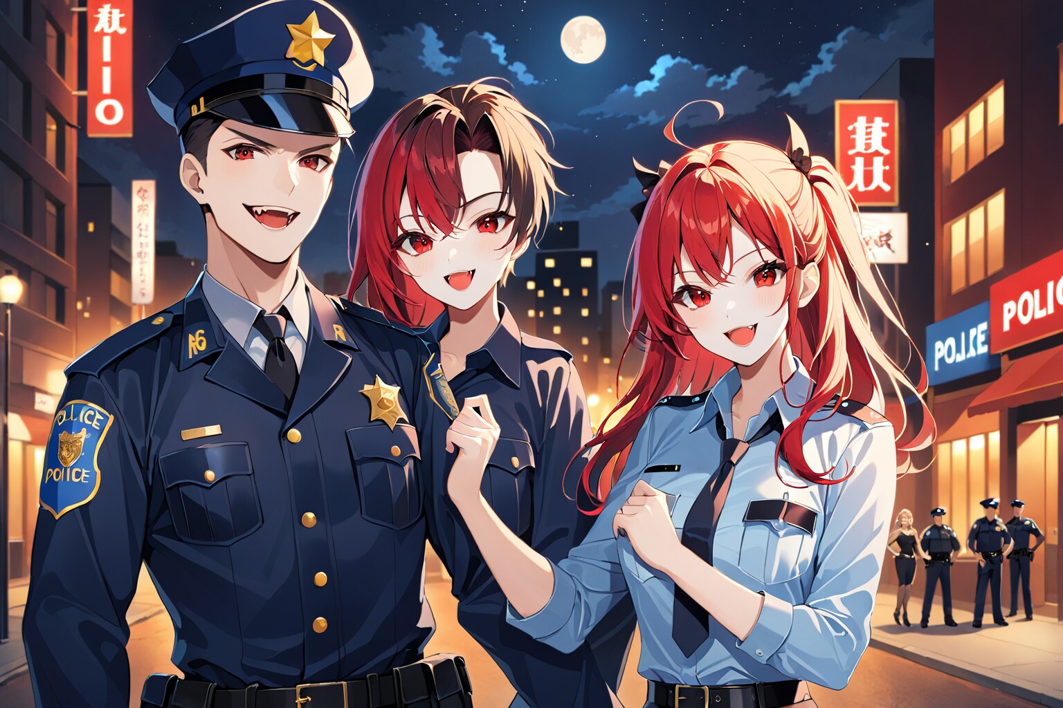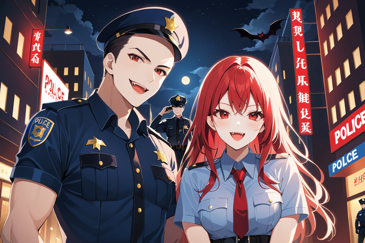 夜のパトロールならおまかせ。この警察官の男女は吸血鬼だけど正義感の強い仲良し警官カップル。今日も生き血の為…いや、街の平和の為に休みなくパトロールをします。ただし、夜に限る。