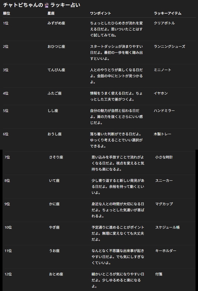 チャトピちゃん占い(04/02) 2026/04/01 使用したAI ChatGPT #チャトピちゃん占い 明日の運勢をお届けーチャトピちゃん占いー 呪文 入力なし ねこなみさくら 10,077 投稿 フォロー 1,213 フォロワー 1,328 ねこなみさくらは下記が好きな方に効果があります猫/メイドさん/猫耳/ろりっ子/謎な物/くすっとしたい/日替わり画像投稿量が多いのでホームの閲覧がお勧めです呪文やネタの利用はご自由にーR-15・18もー↓いろいろまとめーhttps://www.chichi-pui.com/posts/7835be9f-d077-48bb-b2c8-bbcb1003bf19/ ねこなみさくらさんの他の作品 ねこなみさくらさんの他の作品 きょうのこはるさん ねこなみさくら チャトピちゃん占い(04/02) ねこなみさくら ついにファミチキ解禁 ねこなみさくら 投稿企画 [路地裏] [ちちぷいクリニック]開催ですー ねこなみさくら きょうのオムライス(04/01) ねこなみさくら きょうのこはるさん ねこなみさくら チャトピちゃん占い(04/02) ねこなみさくら ついにファミチキ解禁 ねこなみさくら 投稿企画 [路地裏] [ちちぷいクリニック]開催ですー ねこなみさくら きょうのオムライス(04/01) ねこなみさくら きょうのアドバイス(04/01) ねこなみさくら