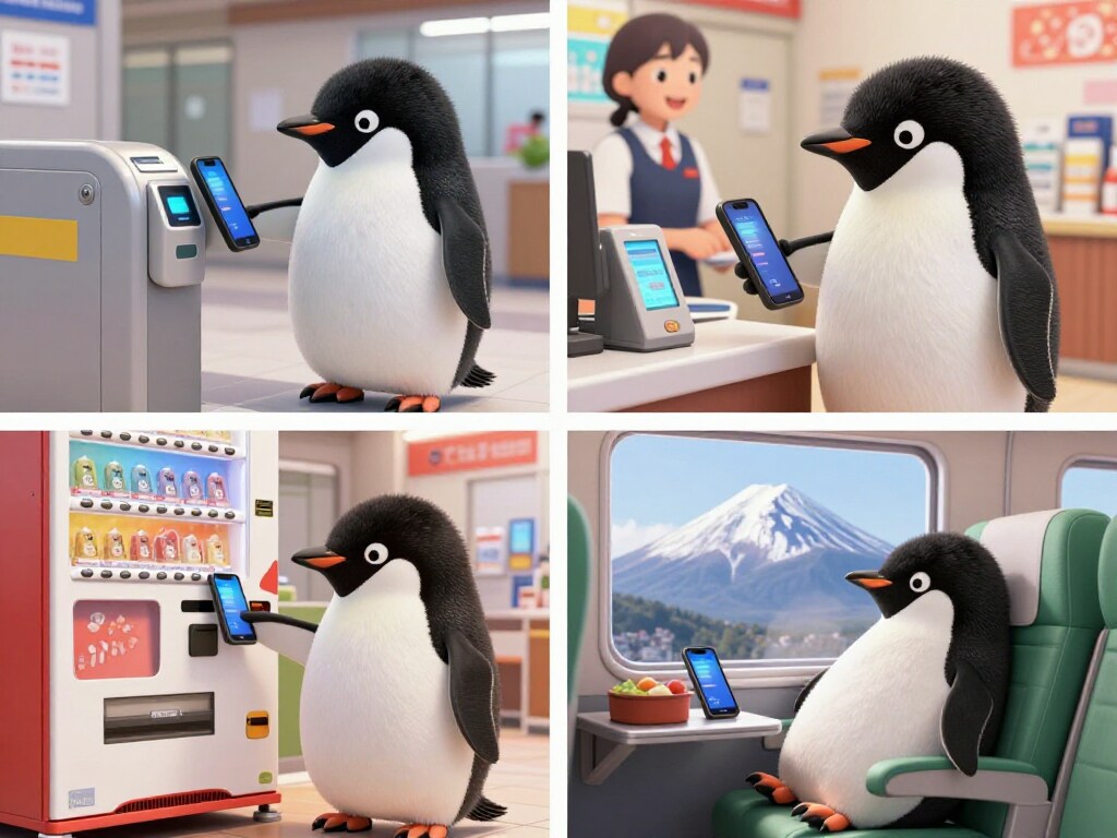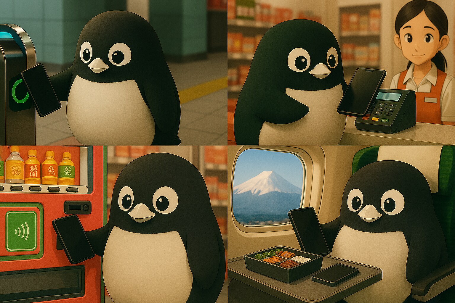 プロンプトコーナー。「Suicaペンギン(名前のないペンギン)とモバイルSuica」をテーマに生成しました。モバイルSuicaで電車、モバイルSuicaでお買い物、モバイルSuicaで自動販売機、モバイルSuicaで新幹線。私はJR東日本の回し者では御座いません(汗...