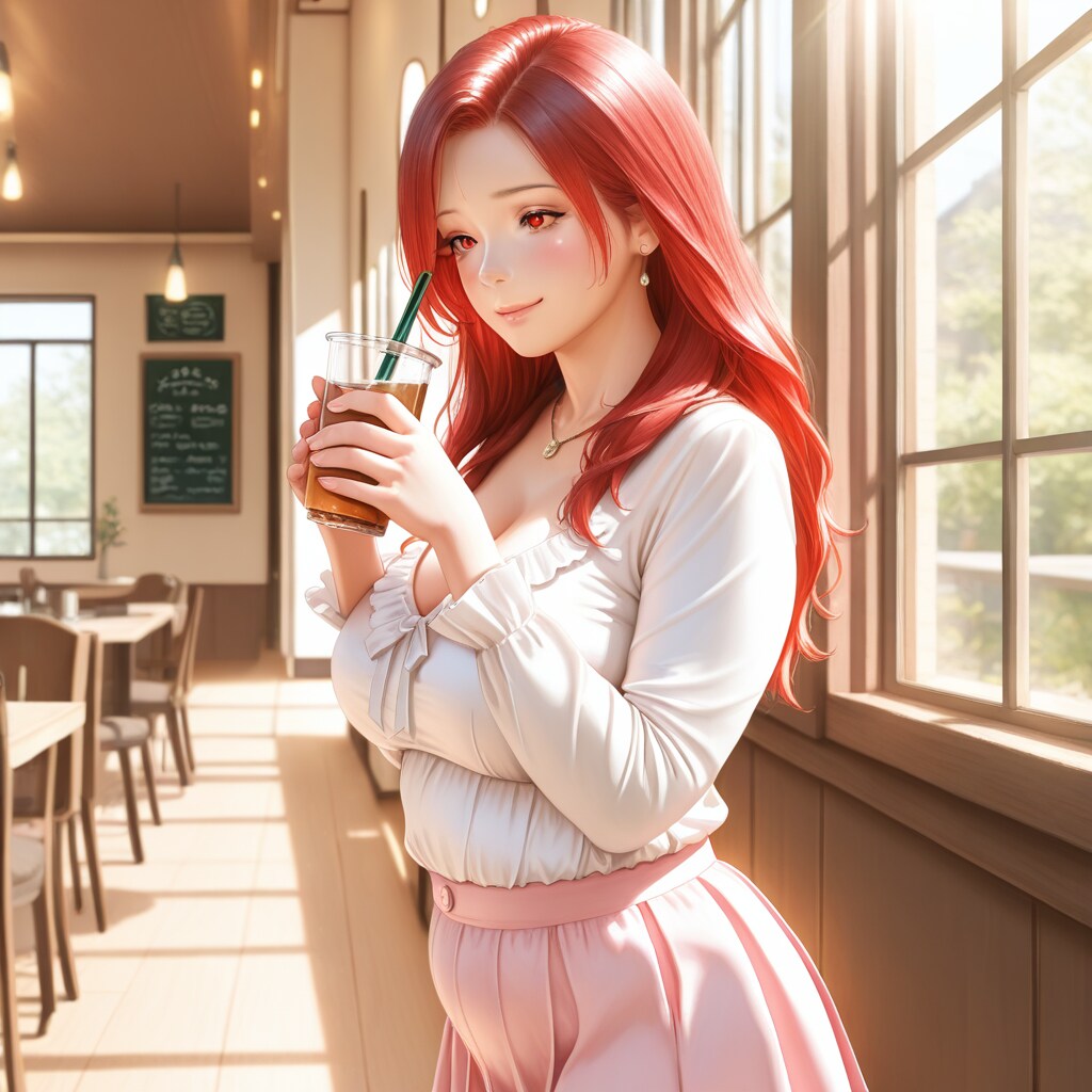 ◆メイドカフェ店長(うちの子)の母親(深紅色のロングヘアを緩くまとめた髪型、52歳、ふくよかで包容力ある母性体型、赤い目)が、店長のお店を訪問しました。
