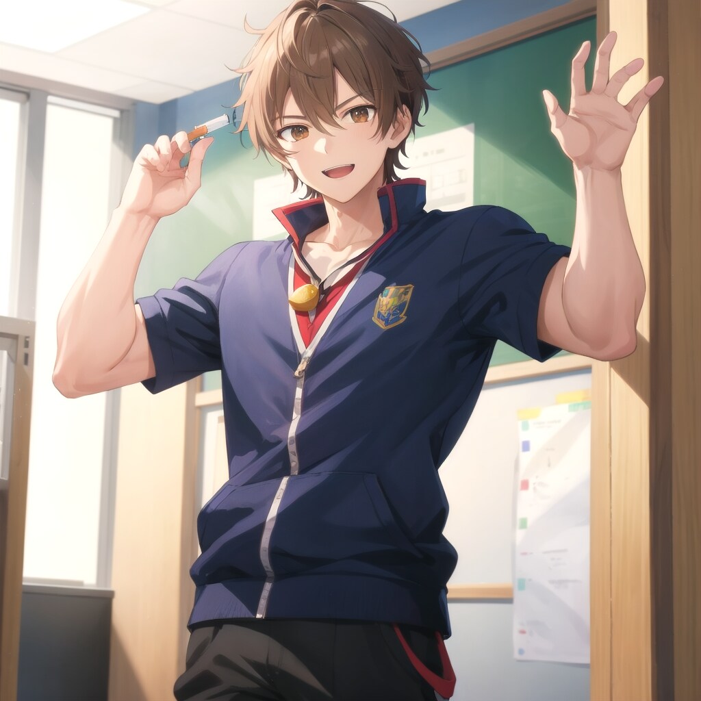 彼は、クラスの誰よりも元気で、常に校内を走り回っている熱血体育系の若手担任教師。茶髪をざっくり切ったラフな髪型に、快活な茶色の目が印象的。学園生活を全力で楽しむことをモットーにしており、生徒たちにも常に笑顔で接する。青髪ボブ子ちゃんの従妹ともテンポが合い、体育祭や部活では名コンビのようなやりとりを見せる。