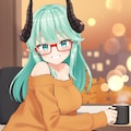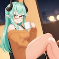 セーターを着てコーヒーを飲むシルヴィアちゃん