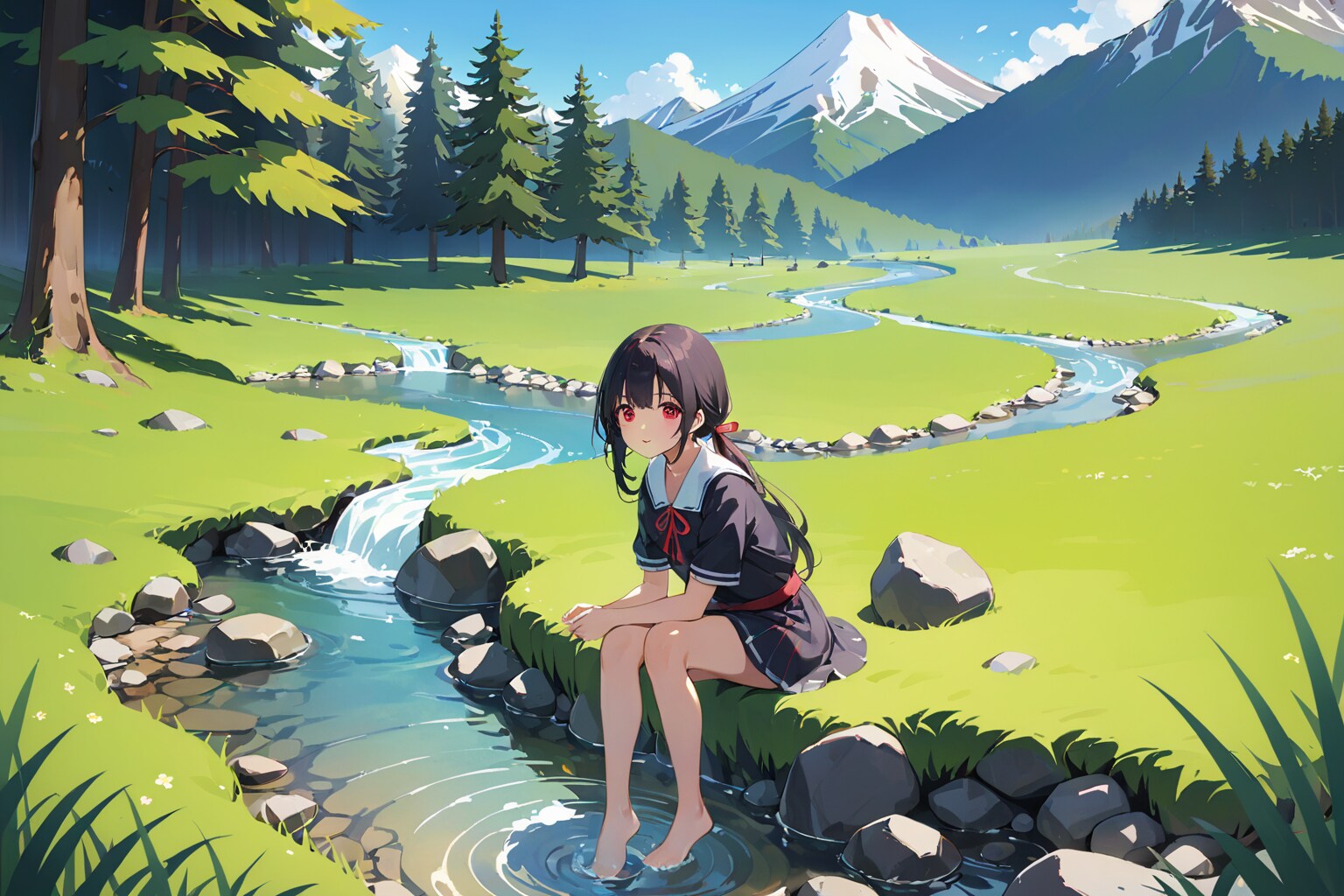 小川のほとりで休憩