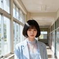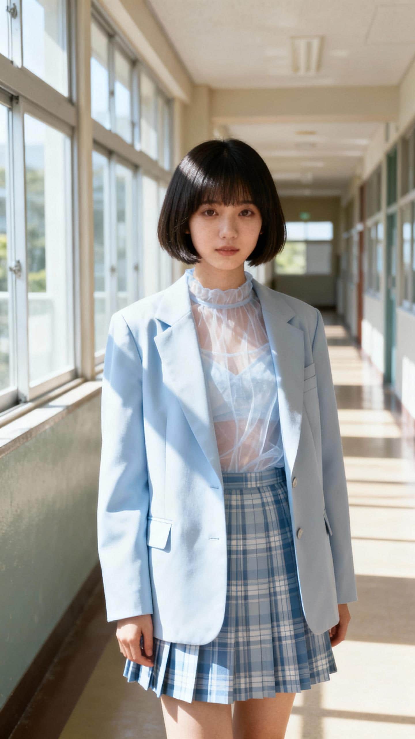 Aラインショートボブ、シースルーマッシュ、ブレザー、チェックのプリーツスカート、スレンダーグラマー、日本の女子高生、日本の高校の制服