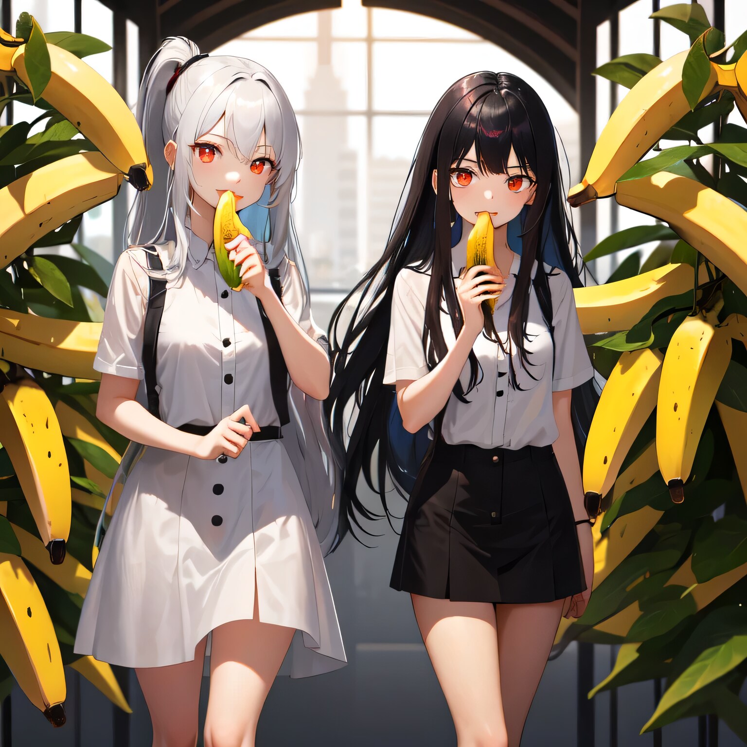 屋内に広がるバナナの楽園。大きくたわわに実った果実の間を、二人の少女が歩いていた。黒髪ロングの少女は白い洋服をひらめかせ、バナナを一口。隣の白髪ポニーテールの少女も、赤い瞳を輝かせながら同じくバナナをかじる。「なぜバナナ?」答えなどいらない。ただ感じるままに、この光景を受け入れるのだ。甘い香りに包まれた空間で、二人は無言のままバナナを味わい続けていた。