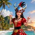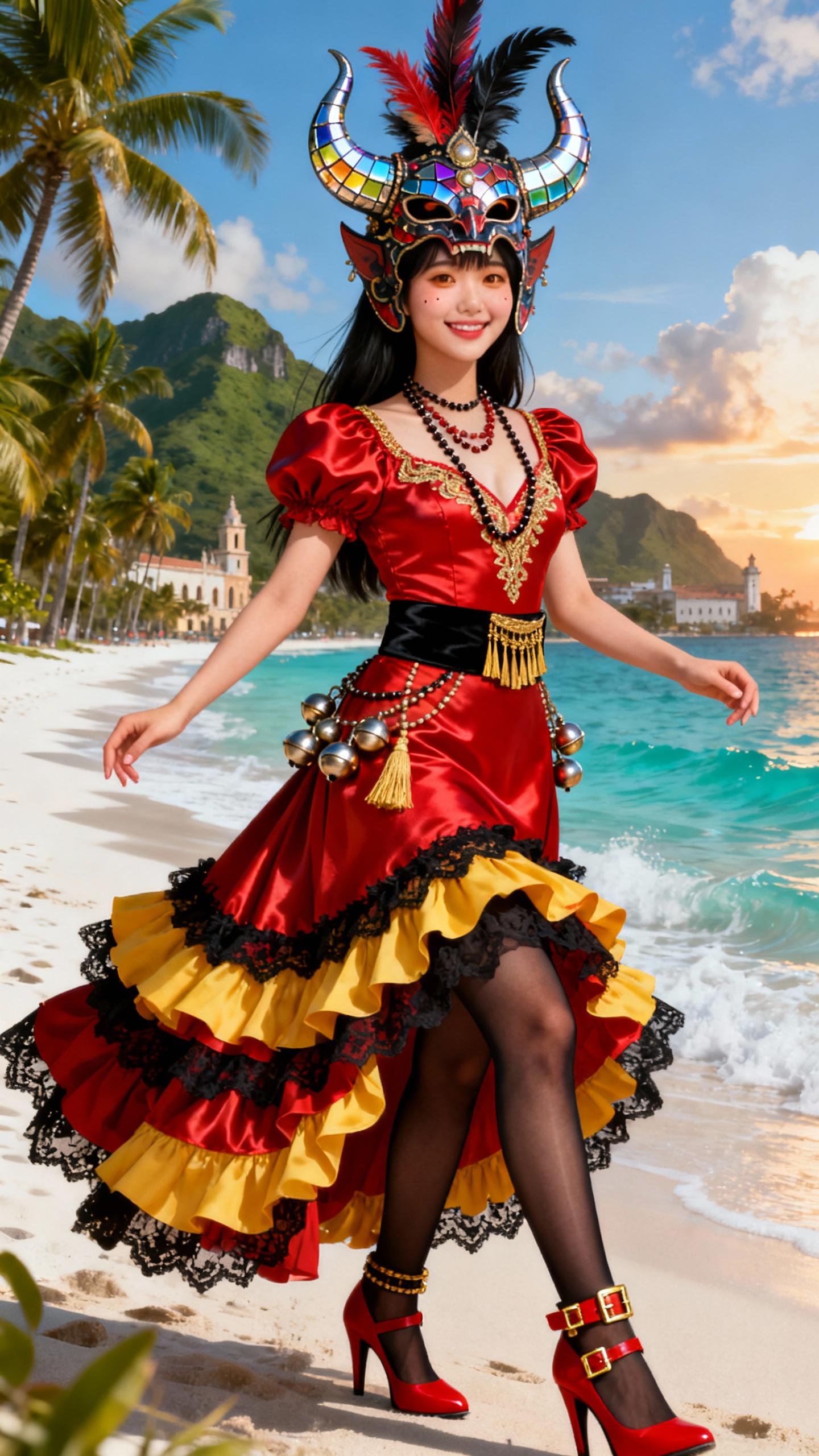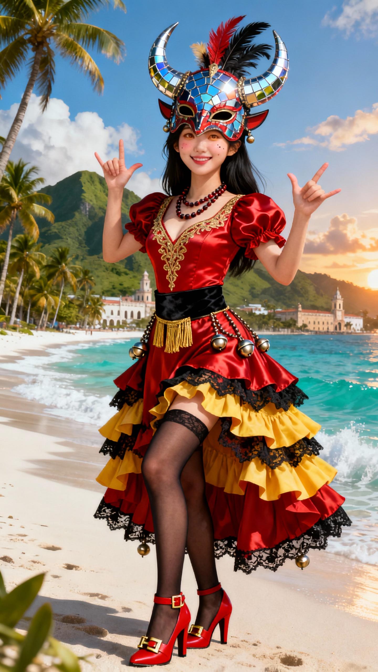 ラ・ベガのカーニバル衣装は、ドミニカ共和国で最も有名な祭りの象徴。悪魔を模した角付きの鏡モザイクマスクに羽根飾り、鮮やかな赤サテンのボディスに金刺繍、パフスリーブ、黒ベルトに金のタッセル、多層の赤黄フリルスカートに黒レース縁取り、鈴付きアクセサリーが特徴の華麗な装い。