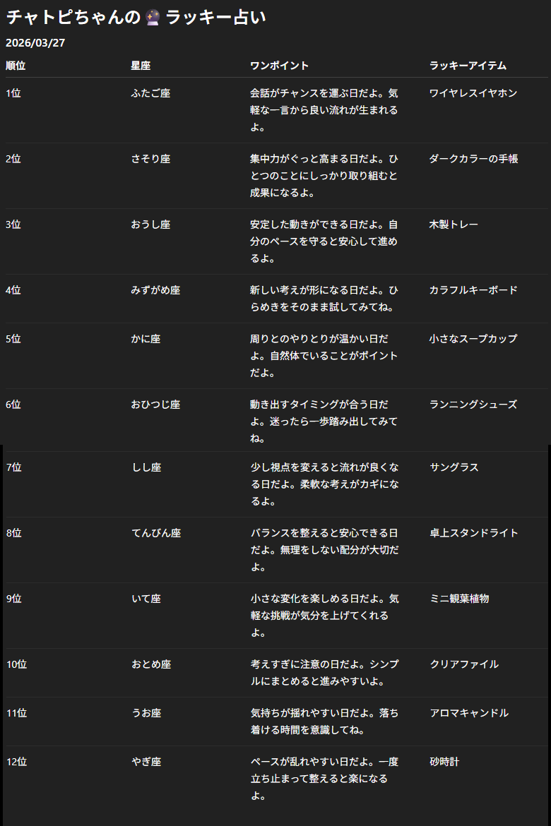 チャトピちゃん占い(03/27) 2026/03/26 使用したAI その他 #チャトピちゃん占い 明日の運勢をお届けーチャトピちゃん占いー 呪文 入力なし ねこなみさくら 9,938 投稿 フォロー 1,211 フォロワー 1,323 ねこなみさくらは下記が好きな方に効果があります猫/メイドさん/猫耳/ろりっ子/謎な物/くすっとしたい/日替わり画像投稿量が多いのでホームの閲覧がお勧めです呪文やネタの利用はご自由にーR-15・18もー↓いろいろまとめーhttps://www.chichi-pui.com/posts/7835be9f-d077-48bb-b2c8-bbcb1003bf19/ ねこなみさくらさんの他の作品 ねこなみさくらさんの他の作品 ナース服姿のGRYPHONちゃんをカプセルに入れたよ ねこなみさくら ナース服姿のTRICKちゃんをカプセルに入れたよ ねこなみさくら ナース服姿のDRAMちゃんをカプセルに入れたよ ねこなみさくら チャトピちゃん占い(03/27) ねこなみさくら ナース服姿のUNICORNちゃんをカプセルに入れたよ ねこなみさくら ナース服姿のGRYPHONちゃんをカプセルに入れたよ ねこなみさくら ナース服姿のTRICKちゃんをカプセルに入れたよ ねこなみさくら ナース服姿のDRAMちゃんをカプセルに入れたよ ねこなみさくら チャトピちゃん占い(03/27) ねこなみさくら ナース服姿のUNICORNちゃんをカプセルに入れたよ ねこなみさくら きょうのいっぴん ねこなみさくら