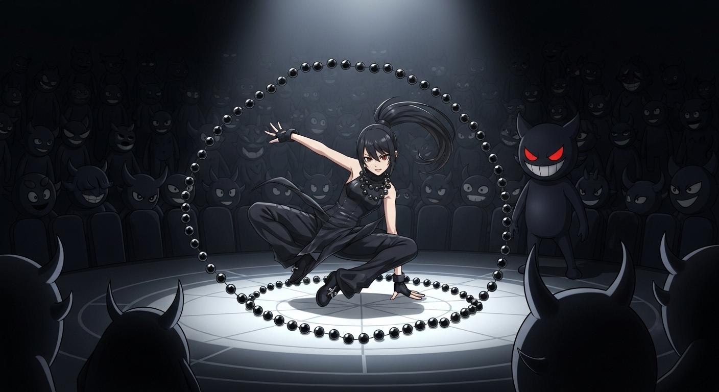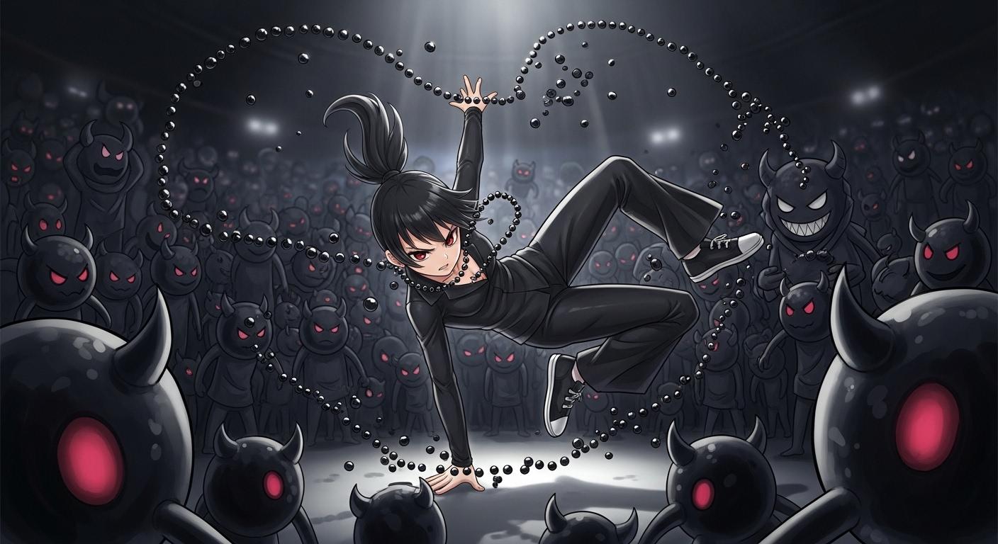 黒ぽにちゃんの動きに合わせて宙を描く黒い数珠は、