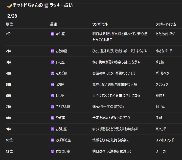 チャトピちゃん占い(12/28) 2025/12/27 使用したAI ChatGPT #チャトピちゃん占い 明日の運勢をお届けーチャトピちゃん占いー 呪文 入力なし ねこなみさくら 9,272 投稿 フォロー 1,109 フォロワー 1,230 ねこなみさくらは下記が好きな方に効果があります猫/メイドさん/猫耳/ろりっ子/謎な物/くすっとしたい/日替わり画像投稿量が多いのでホームの閲覧がお勧めです呪文やネタの利用はご自由にーR-15・18もー↓いろいろまとめーhttps://www.chichi-pui.com/posts/7835be9f-d077-48bb-b2c8-bbcb1003bf19/ ねこなみさくらさんの他の作品 ねこなみさくらさんの他の作品 てててー、てってててー(01/16) ねこなみさくら 5.開催決定の投稿企画 ねこなみさくら 4.過去の投稿企画 ねこなみさくら 3.メインのコンテンツ? ねこなみさくら 2.便利かもしれない診断メーカー ねこなみさくら てててー、てってててー(01/16) ねこなみさくら 5.開催決定の投稿企画 ねこなみさくら 4.過去の投稿企画 ねこなみさくら 3.メインのコンテンツ? ねこなみさくら 2.便利かもしれない診断メーカー ねこなみさくら 1.ねこなみ素材とわたしについて ねこなみさくら