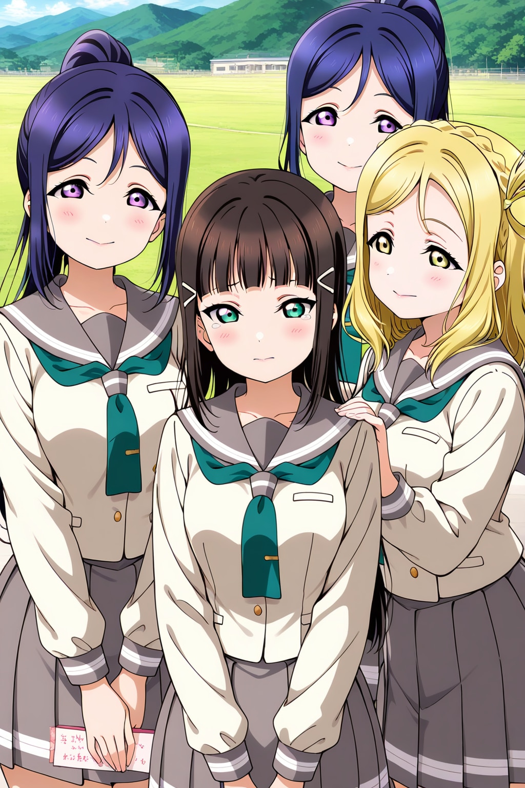 卒業テーマでラブライブ!サンシャイン‼︎3年生トリオの卒業式のを生成したけど果南が2人になってしまって1人をステッカーアプリで隠して②元の果南が2人💦