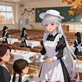 5枚目がSeedreamで、こちらは本来目的としていた「教室内」「母娘の給仕を担当」という部分はきちんと出力しているんですが