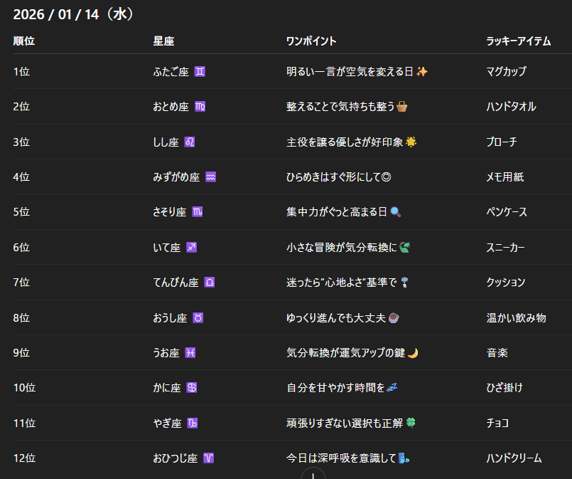 チャトピちゃん占い(01/14) 2026/01/13 使用したAI ChatGPT #チャトピちゃん占い 明日の運勢をお届けーチャトピちゃん占いー 呪文 入力なし ねこなみさくら 9,257 投稿 フォロー 1,107 フォロワー 1,228 ねこなみさくらは下記が好きな方に効果があります猫/メイドさん/猫耳/ろりっ子/謎な物/くすっとしたい/日替わり画像投稿量が多いのでホームの閲覧がお勧めです呪文やネタの利用はご自由にーR-15・18もー生成用?自作診断メーカーまとめhttps://www.chichi-pui.com/posts/824ee8bb-e261-4f91-bb51-afb6142bc12b/ ねこなみさくらさんの他の作品 ねこなみさくらさんの他の作品 じぇみにゃん🐾とチャトピちゃん ねこなみさくら Pくん もくげきじょうほう ねこなみさくら チャトピちゃん占い(01/15) ねこなみさくら SIMPLEシリーズシリーズ ねこなみさくら きょうのオムライス(01/14) ねこなみさくら じぇみにゃん🐾とチャトピちゃん ねこなみさくら Pくん もくげきじょうほう ねこなみさくら チャトピちゃん占い(01/15) ねこなみさくら SIMPLEシリーズシリーズ ねこなみさくら きょうのオムライス(01/14) ねこなみさくら 円グラフでもうちょっと遊んでみた ねこなみさくら