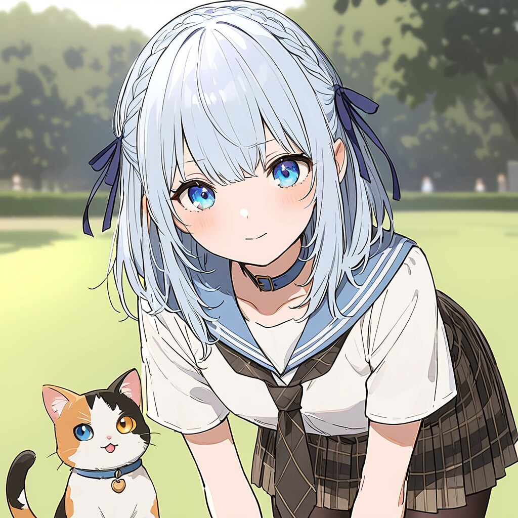 銀髪ミディアムの美少女が、美しい芝生の公園でかがんでいます。彼女の目は、目の前にいる三毛猫と優しく見つめ合っています。昼の陽光が二人を包み込み、まるで時間が止まったかのような静けさが漂います。少女の穏やかな表情と猫のリラックスした姿が、この瞬間の特別さを物語っています。公園の緑と陽光が織りなすコントラストが、心に残る一枚の絵を描き出しています。彼女は何を思い、何を感じているのでしょうか。この一瞬の中に、無限の物語が広がっているようです。