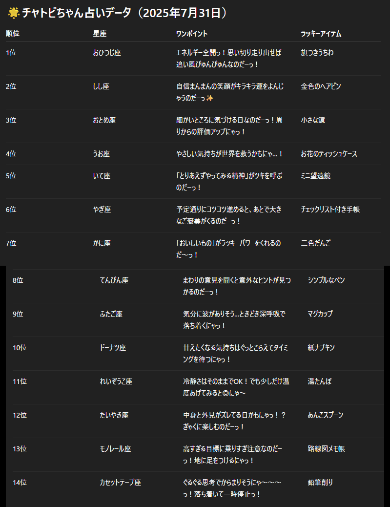 チャトピちゃん占い(7/31) 2025/07/30 使用したAI ChatGPT #チャトピちゃん占い 明日の運勢をお届けチャトピちゃん占いー 呪文 入力なし ねこなみさくら 8,851 投稿 フォロー 1,040 フォロワー 1,146 ねこなみさくらは下記が好きな方に効果があります猫/メイドさん/猫耳/ろりっ子/謎な物/くすっとしたい/日替わり画像投稿量が多いのでホームの閲覧がお勧めです呪文やネタの利用はご自由にーR-15・18もー生成用?自作診断メーカーまとめhttps://www.chichi-pui.com/posts/824ee8bb-e261-4f91-bb51-afb6142bc12b/ ねこなみさくらさんの他の作品 ねこなみさくらさんの他の作品 メントスとコーラを合成 ねこなみさくら サムネホイホイのボツ画像 ねこなみさくら チャトピちゃん占い ねこなみさくら 日付を入れてみる 12/19 ねこなみさくら チャトピちゃん占い(12/20) ねこなみさくら メントスとコーラを合成 ねこなみさくら サムネホイホイのボツ画像 ねこなみさくら チャトピちゃん占い ねこなみさくら 日付を入れてみる 12/19 ねこなみさくら チャトピちゃん占い(12/20) ねこなみさくら もぐもぐもぐもぐ ごくごく簡単なプロンプト ねこなみさくら