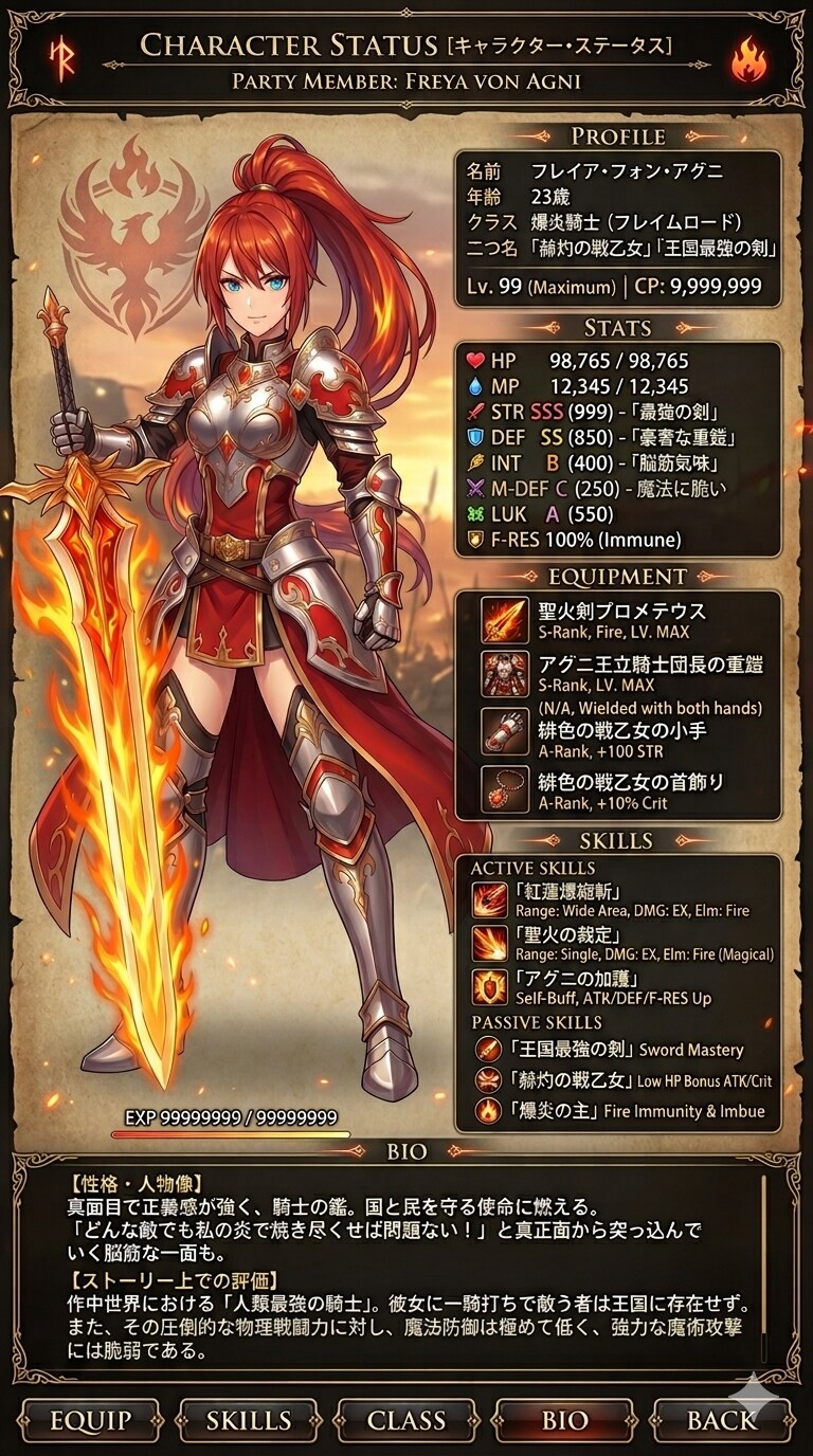 真面目で正義感が強く、騎士の鑑のような性格。国と民を守る使命に燃えており、主人公(プレイヤー)に対しても時に厳しく、時に優しく導いてくれる頼もしい先輩ポジションです。少々脳筋気味で、「どんな敵でも私の炎で焼き尽くせば問題ない!」と真正面から突っ込んでいく傾向があります。