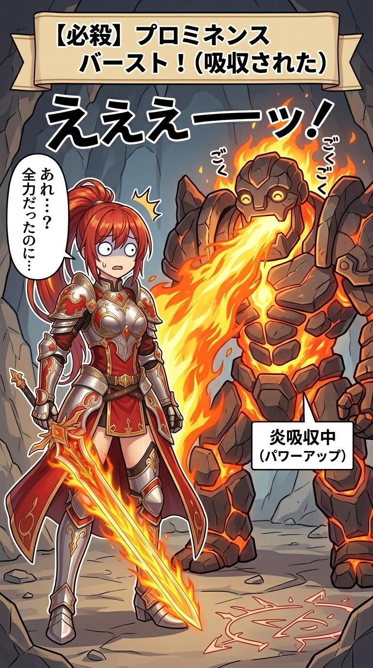 物語後半、いざ彼女が本格的にパーティに加入し強敵と戦う中盤〜終盤にかけて、敵の主力部隊がなぜか**「水棲魔族」「灼熱火山のゴーレム(炎吸収)」「炎無効の古代竜」**ばかりになります。メインウェポンが炎属性固定の彼女は、終盤のボス戦でことごとくダメージを半減、あるいは吸収されてしまいます。