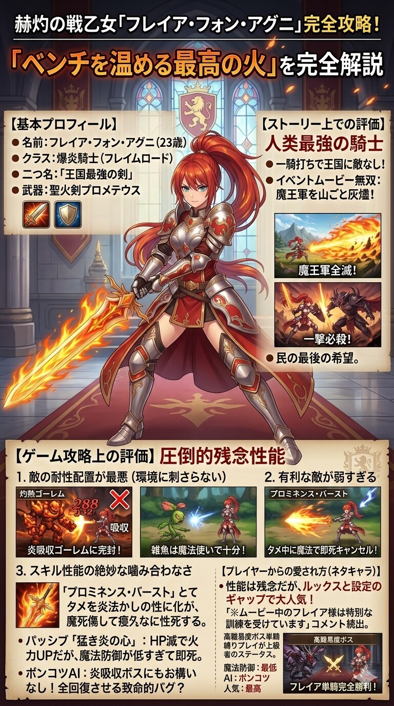 パッシブスキル「猛き炎の心」: 自身のHPが減るほど攻撃力が上がりますが、彼女の防具は「魔法防御」が極端に低いため、魔法攻撃を受けると火力を出す前に即死します。