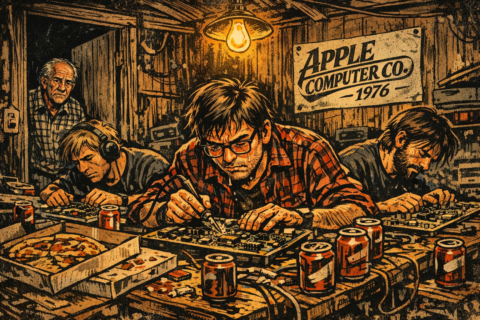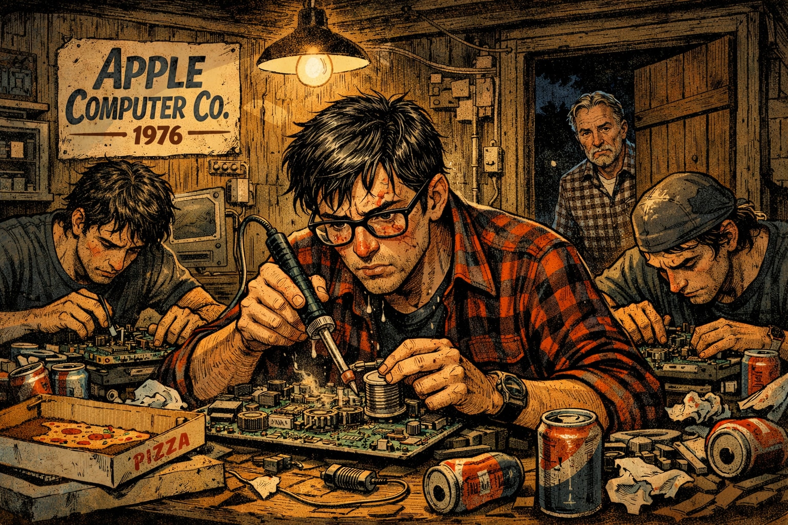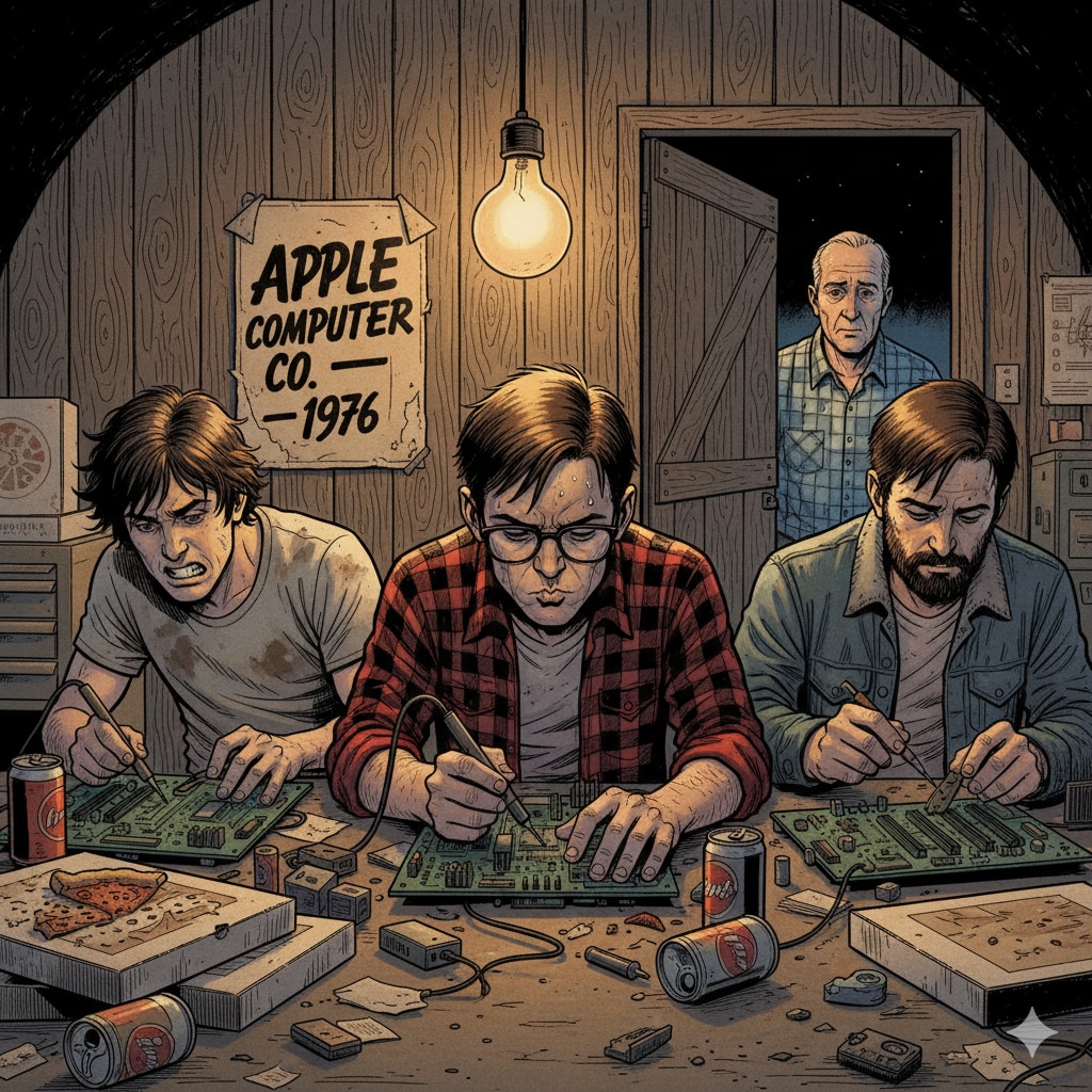 ここからが時間との戦いです。支払い期限の30日が来る前に、組み立てて、納品して、集金しなければなりません。 ジョブズの自宅ガレージ(実態はただの在庫置き場)に、ジョブズ、ウォズニアック、そして助っ人の友人たちが集まり、不眠不休で基板をハンダ付けしました。ウェインが「竜巻の尻尾を掴んでいるようだ」と震えていたのは、まさにこの、**「一歩間違えれば全員破産」**という狂気じみたスピード感に対してでした。