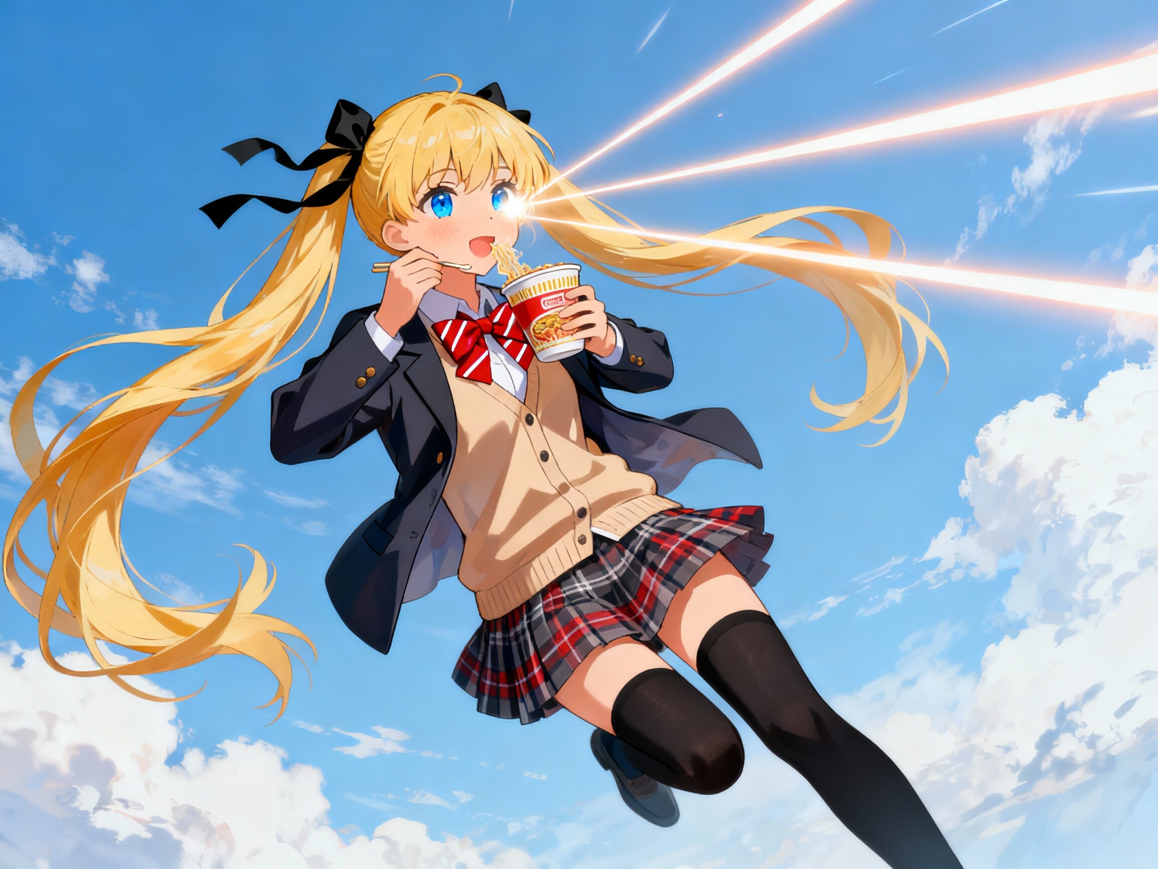 空を飛びながら目からビームを出して、カップラーメンを食べてるイラスト